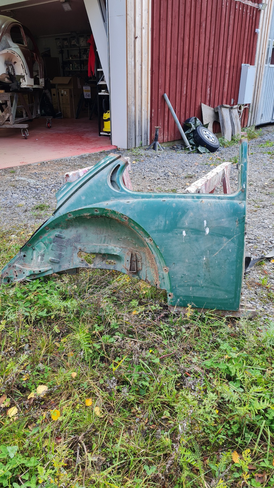 Första borra svetspunkterna, sen lätt sandblästring på insidan. Hålen till sidolisten är givetvis för högt, men i övrigt en perfekt passform även med en åldersskillnad på ca 20 år