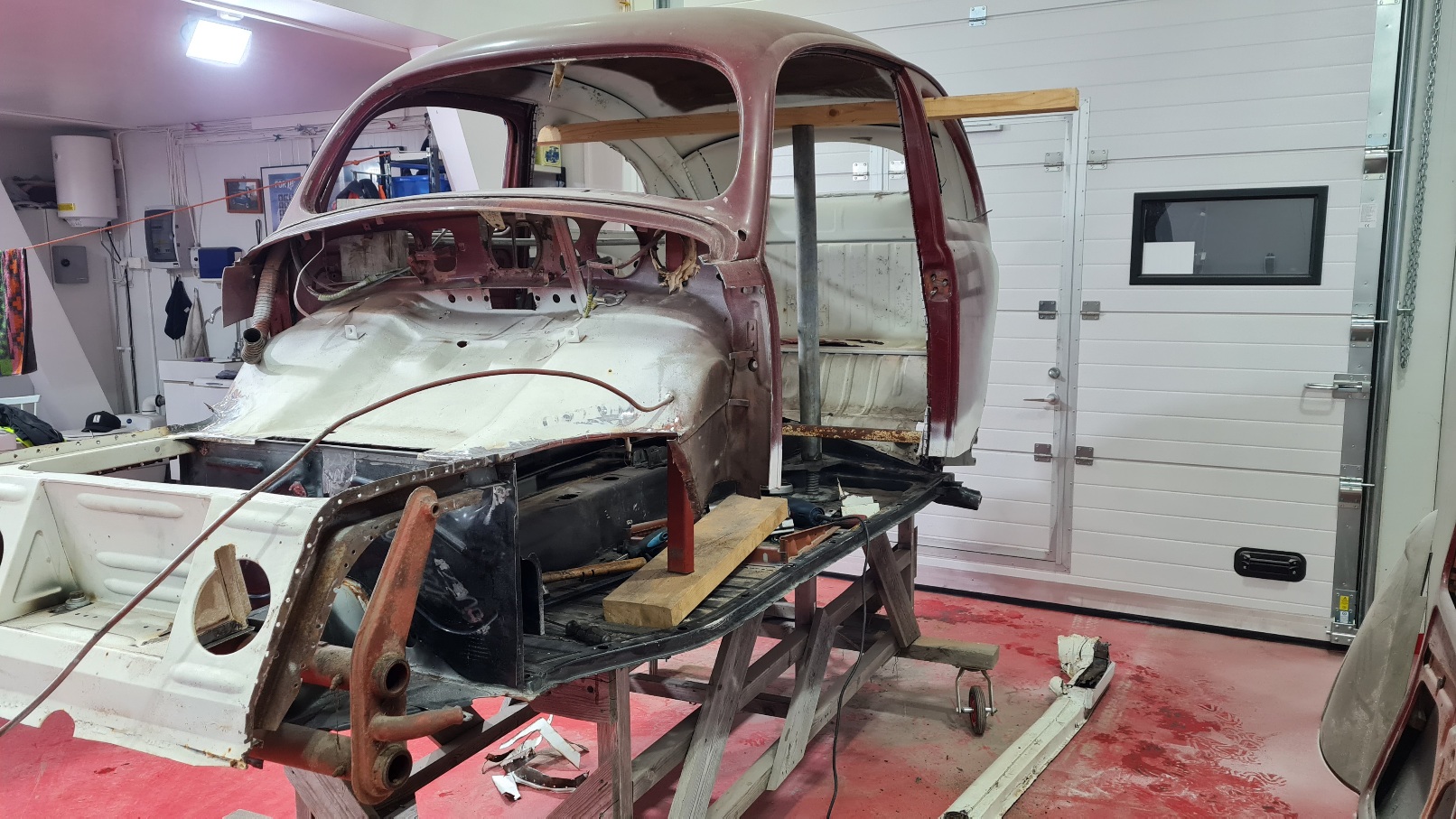 Nu har projektet gått framåt igen. Ibland är det brist på tid och då får man bara drömma om att åka till garaget.  Bakdelen blev så gott som klar. Rev då upp hela fronten eftersom den är sned och gömd rost förstås inne i balkar. En hel del borrande men nu är det bara att börja mäta upp.