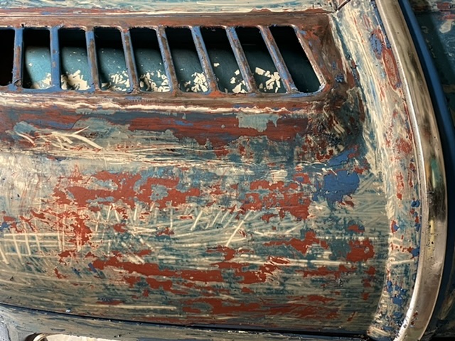 bilen målades av min far med enkomponent industrifärg, roller o pensel . . . ganska tjockt skulle jag säga. bilen tappade definition i linjerna, såg bara svullen ut. sen är där många ställen där det blivit hål i "lacken" o rosten börjat krypa, om än ytligt, måste åtgärdas innan det går för långt. o så body under färgen ca 20 cm nederst på karaossen . . . som, just det, är omlackad tre (eller fyra??) gånger redan tidigare