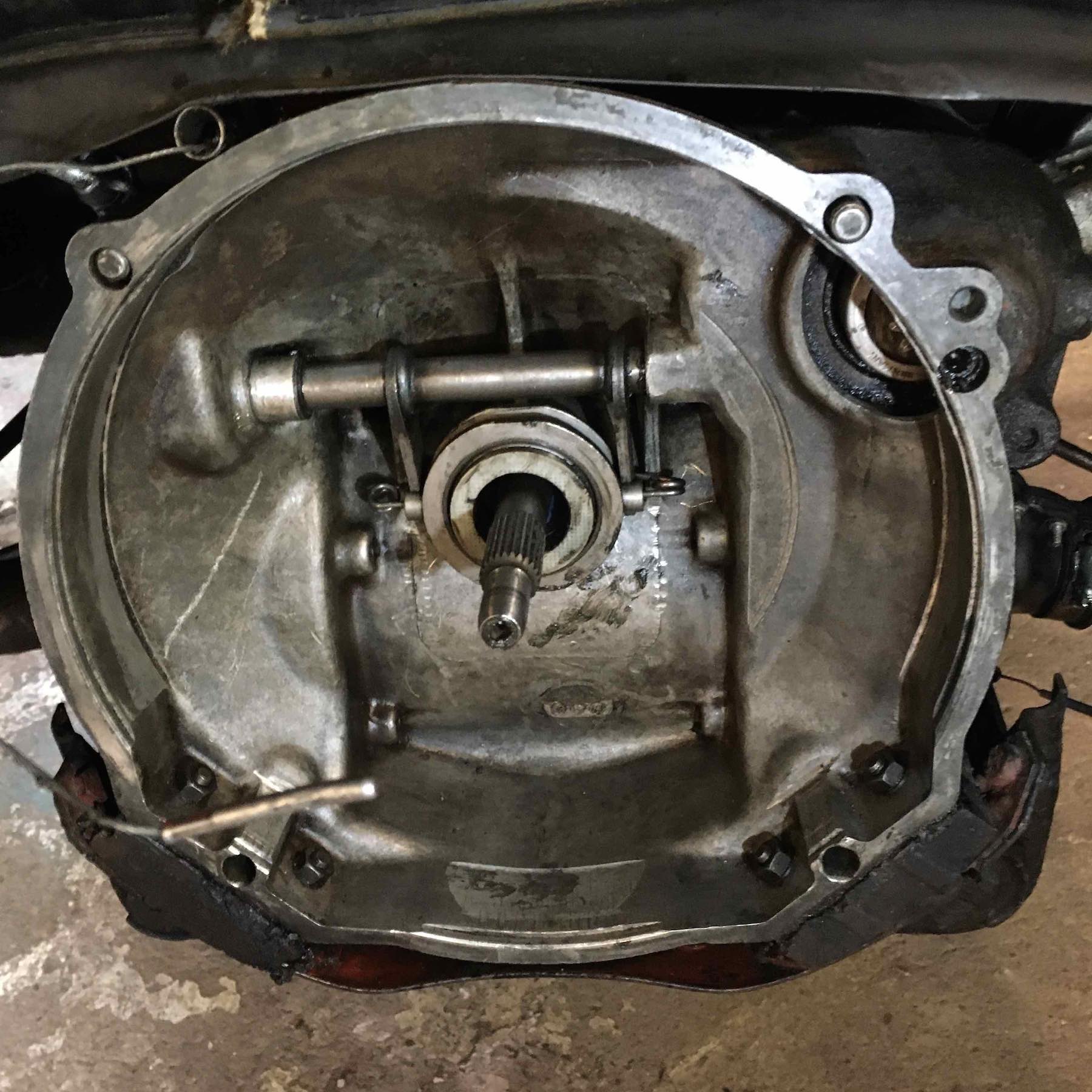 Den var visserligen "på verkstad" men jag gjorde 95% av jobbet pga allt från sjukfrånvaro till allmän okunskap. Men, överlägset enklare att ta ut motorn med hjälp med lift och domkraft. I hemma-garaget med pallbockar och solo blir det segt.