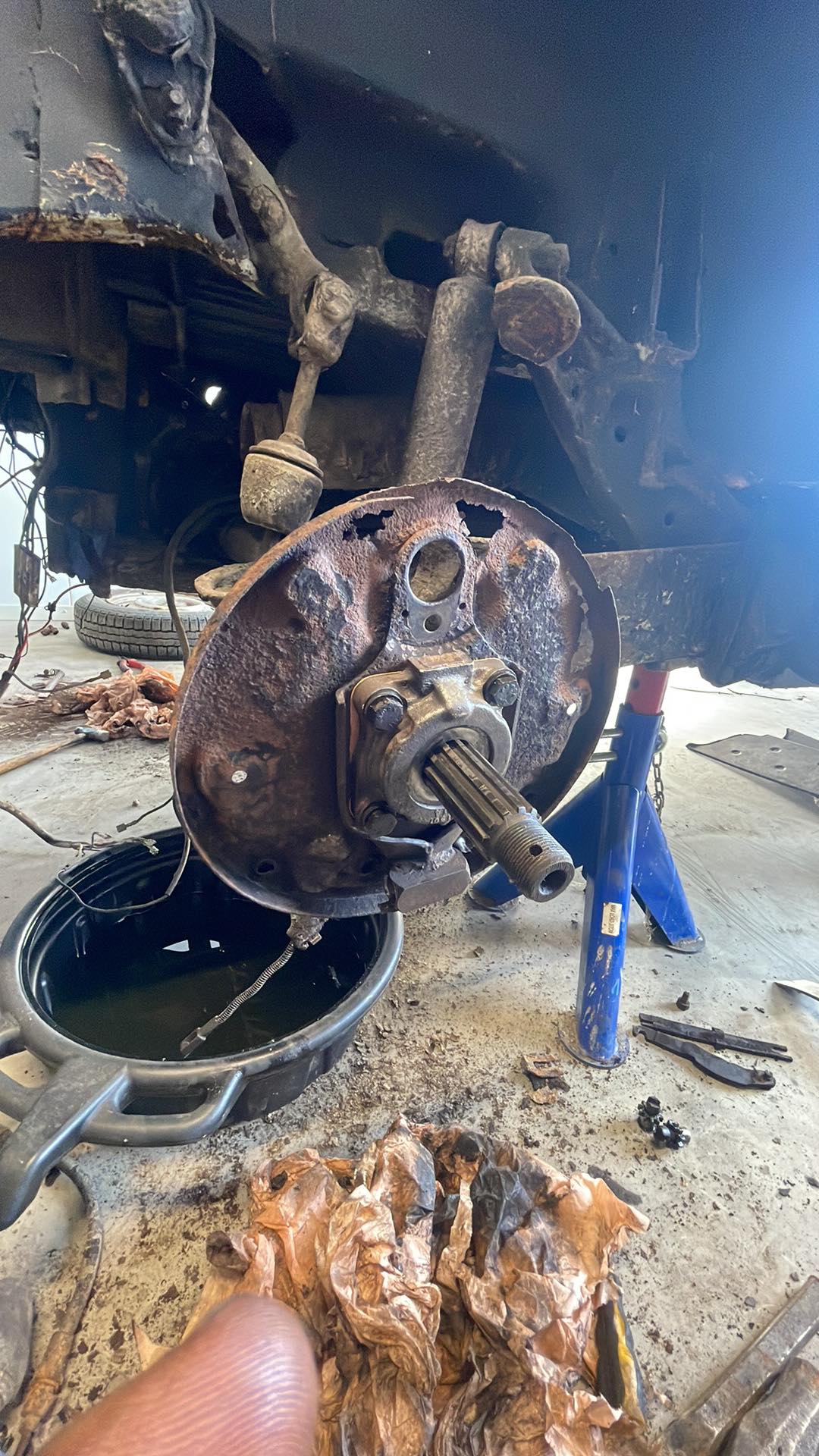 Tog även ner bromsskölden bak för att göra rent efter läckage. Där är en hel del rosthål, men det ska gå igenom bes. Tanken är att besiktiga bilen och sedan bygga om den  ICQ/ag