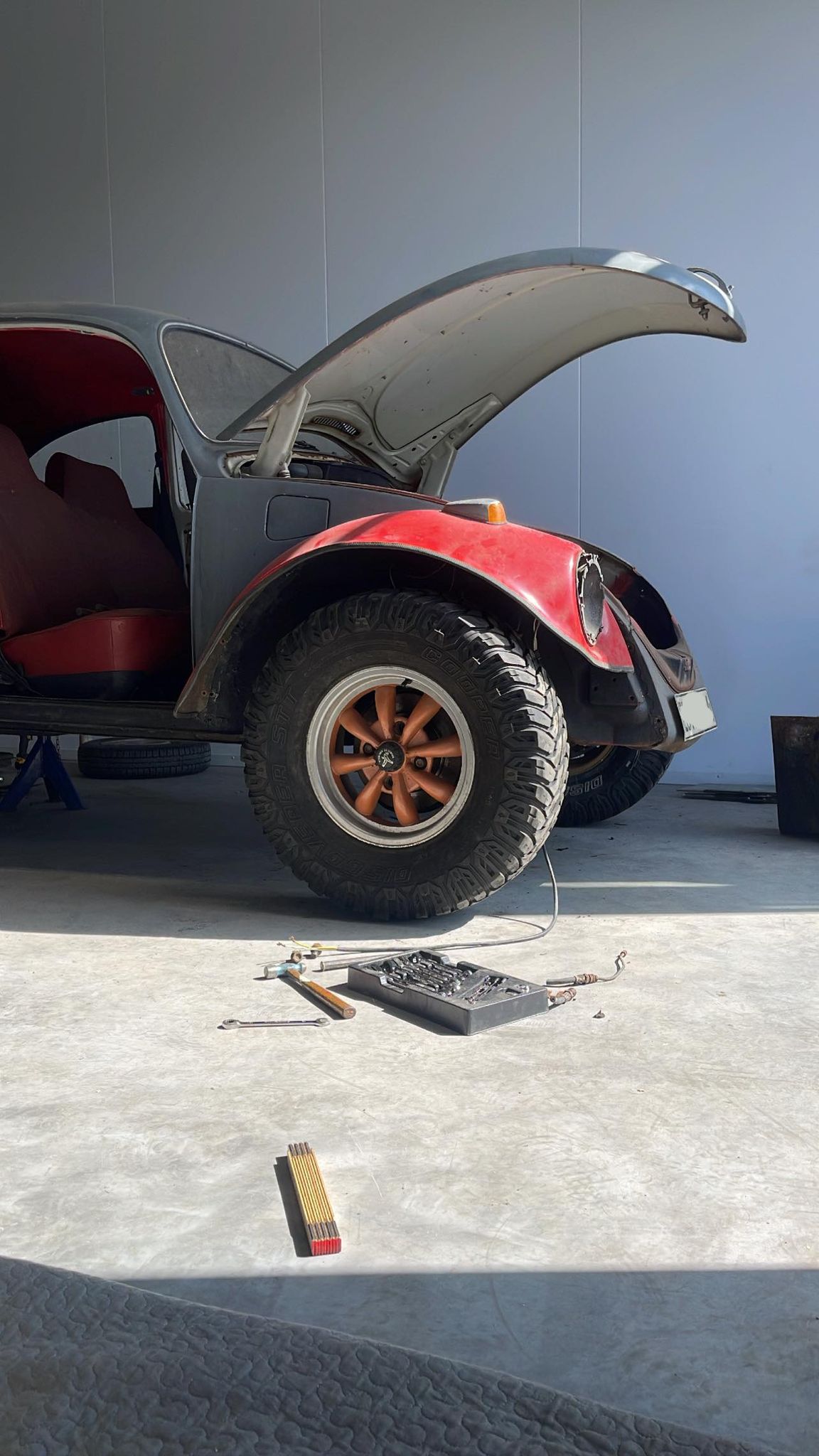 Behövde ha plåtfälgarna bak för att släppa på muttern till bromstrummorna, så då får man passa på att ta en motivationsbild, eller två