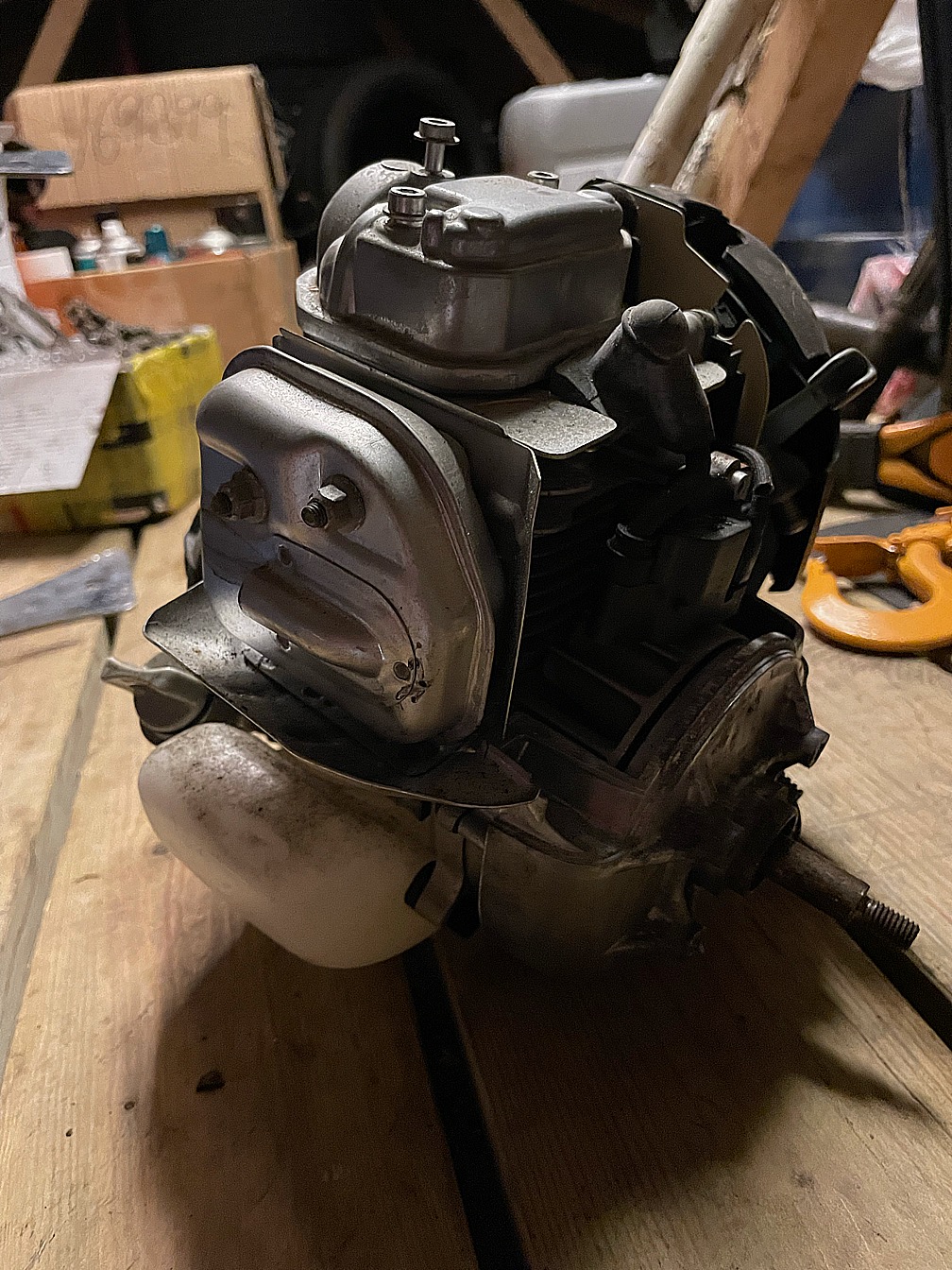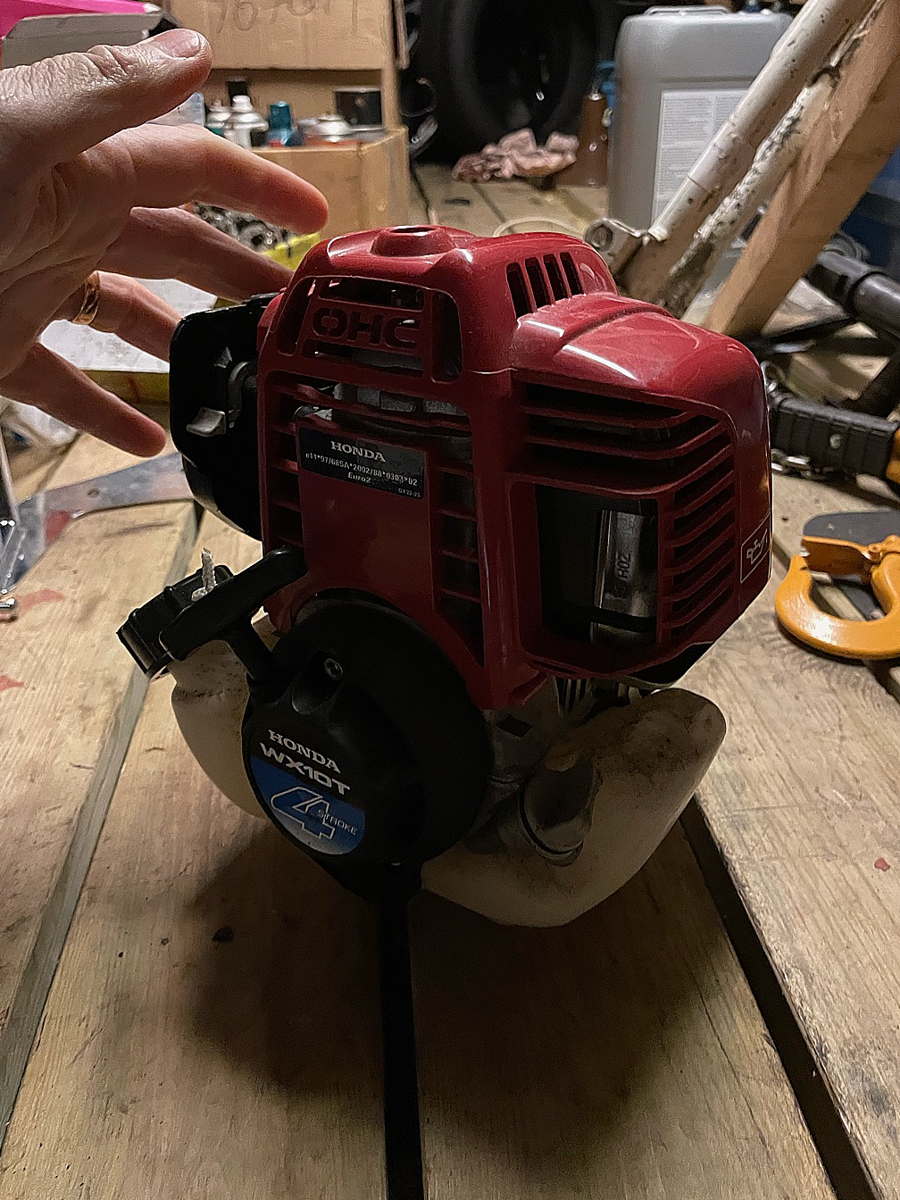 För en femhundring extra så ingår en Honda fyrtakts röjsågs motor som passar med lite modifiering. Den är typ ny, har två gångtimmar