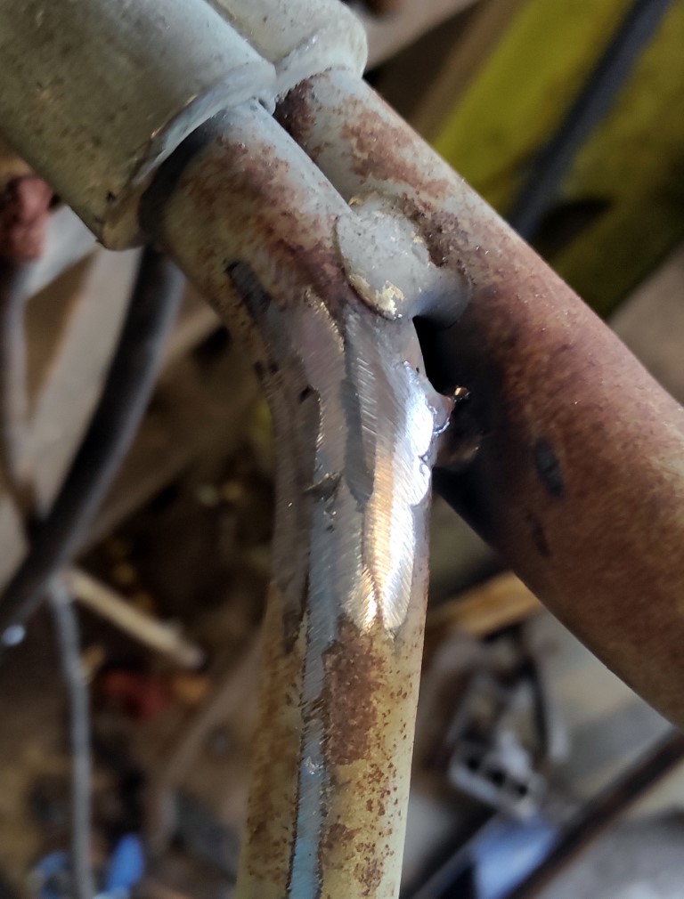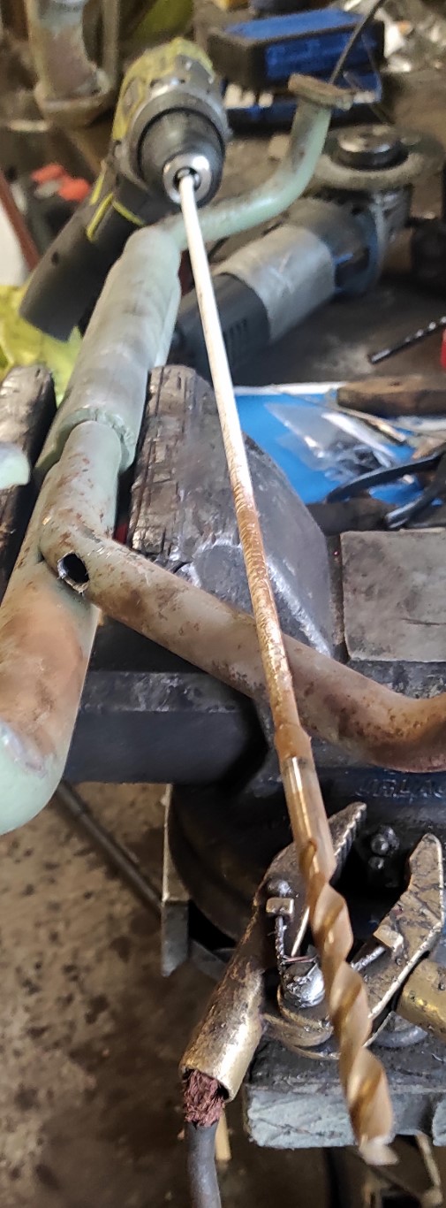 Ta en en svetstrådsmatarslang och klipp en 40cm lång bit av själva spiraltråden. Sätt i en borrmaskin och kör in i förvärmningsröret. Hjälper också att värma röret med gasol och knacka försiktigt på röret när det är varmt.