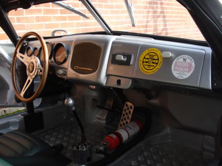 Bilen har ett rörchassi med riktig bur och bucket seats i grönt läder och alu paneler, så läcker