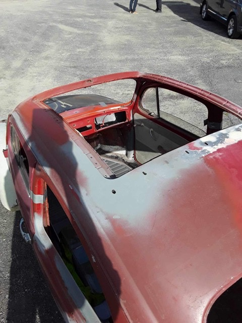 Karossen är rostfri med nya plåtdetaljer klar för spackling och lack. Fattigmanstaket är helt nytt i paket , beige.