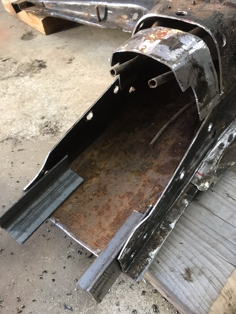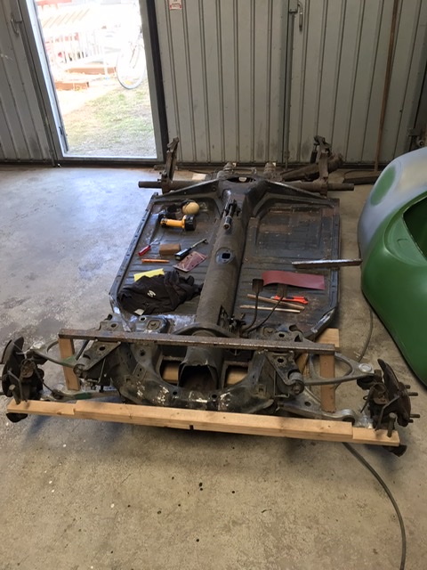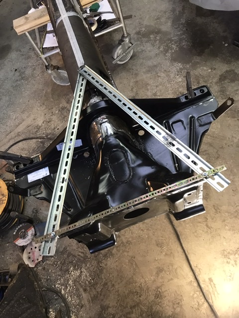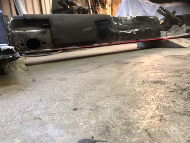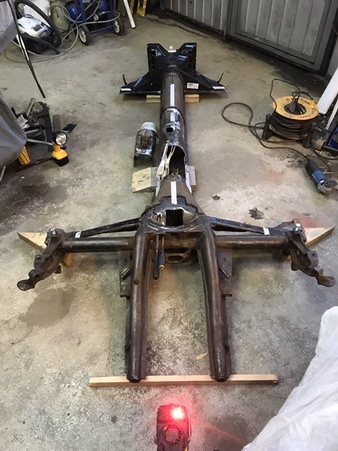 Så blev det dax att prova in ramhuvudet för att sedan svetsa det på plats och även napolionhatten. Stor hjälp fick man av lasern för att även få tunneln rak. Nu blir det till att måtta in kapningen av tunneln, passade också på att flytta bak växelspaken lite så blir det lättare att lägga treans växel.