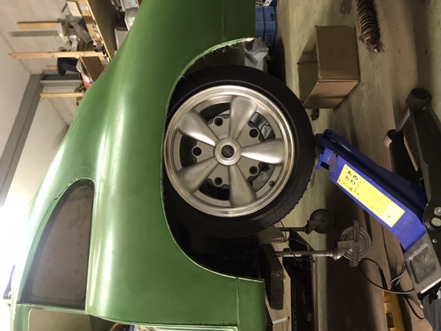 Var nu tvungen att hänga på karossen och testa ett hjul för att se ungefär hur det ser ut, hissade upp hjulet för ett ungefärligt utseende, får se vad det blir för fälgar sedan i slutändan.