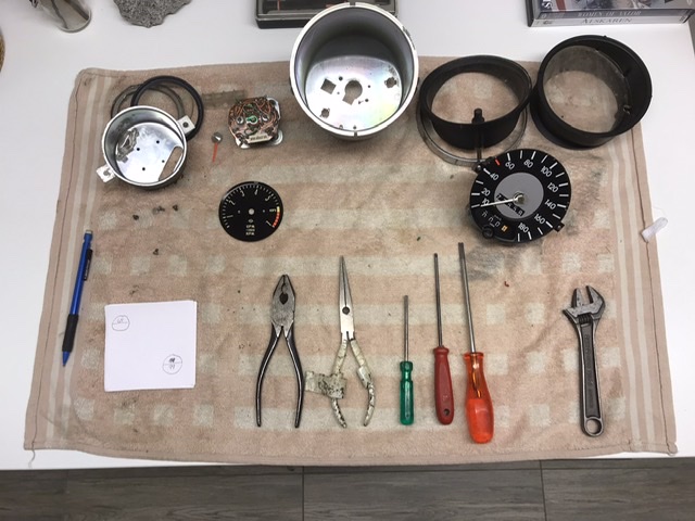Under tiden så kan ombyggnaden av varvräknaren göras , demonterat en hastighetsmätare som jag hade 2 av för att bli en varvräknare men då behöver jag hjälp av min ena son som har en reklamfirma för att göra en ny tavla. Så blev förslaget , så nu ska det tryckas på vinyl och monteras.