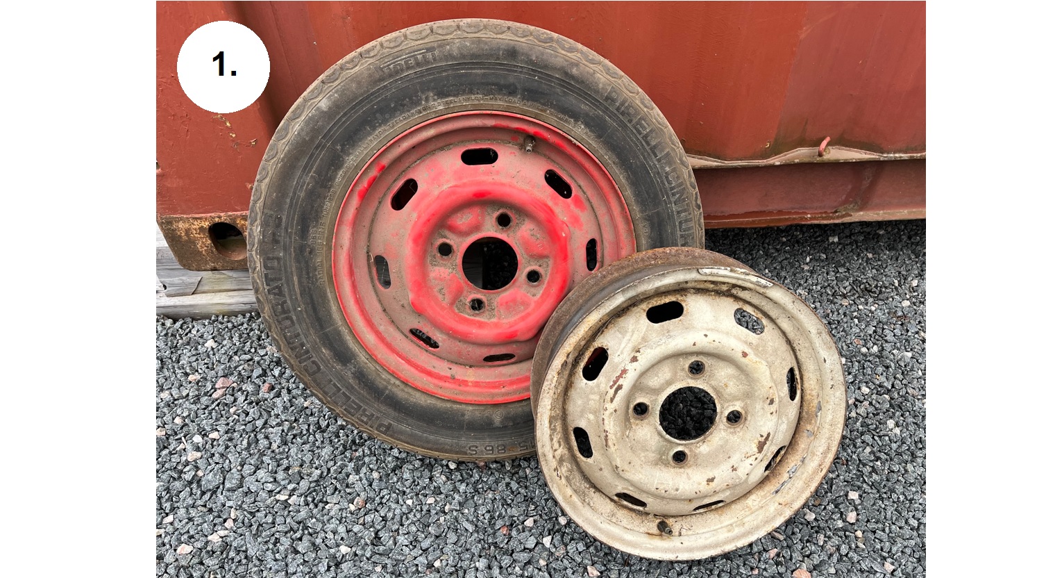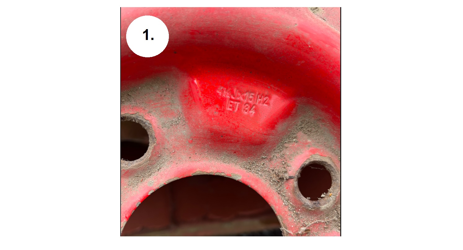 1. Två original VW 4-bultsfälgar 4½Jx15" ET 34. Dessa två är av den bredare sorten. Vanligast är 4Jx15". Inga synliga skador men behöver väl en blästring o lack. Pris 500 Kr
