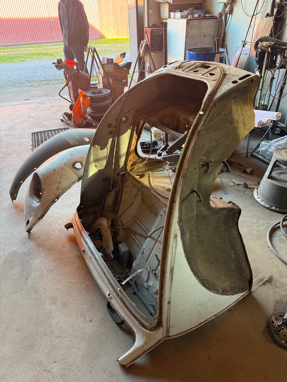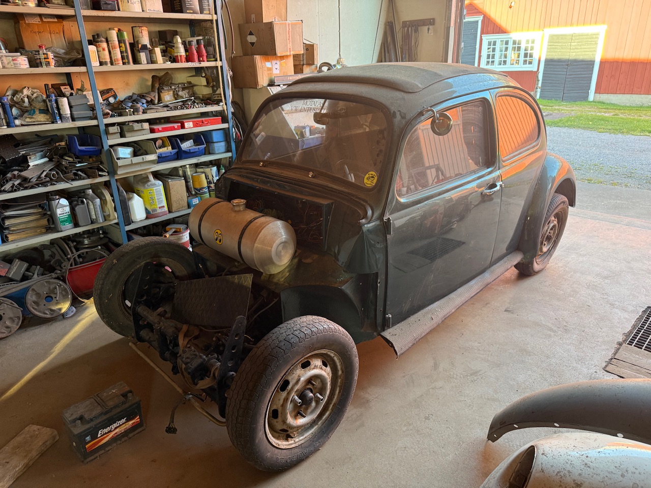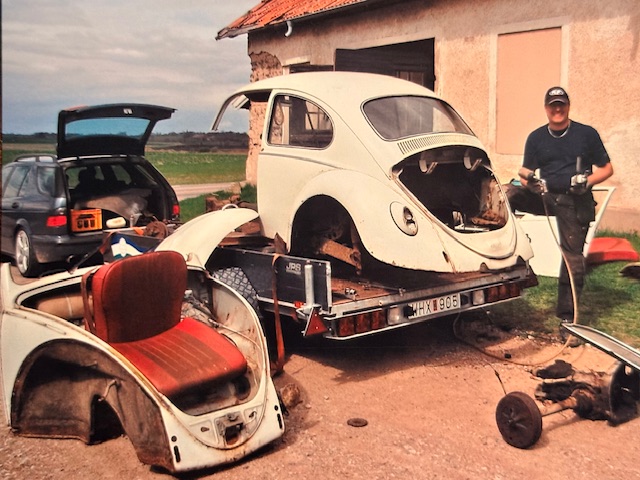 Nu är det dags att spola fram bandet till nutid. När jag lånade min väns Lars.T släp för att transportera min Ghia på ”för några år sedan” så råkade Bulan så på släpet när jag lämnade tillbaka det. Vi knuffade in bilen i ladan för att ”köa” den. Lars råkar vara en fenomenal plåtis och redan nu: Stort tack Lars! Det betyder väldigt mycket för mig att du hjälper mig med Bulan! Tack!