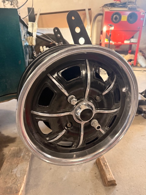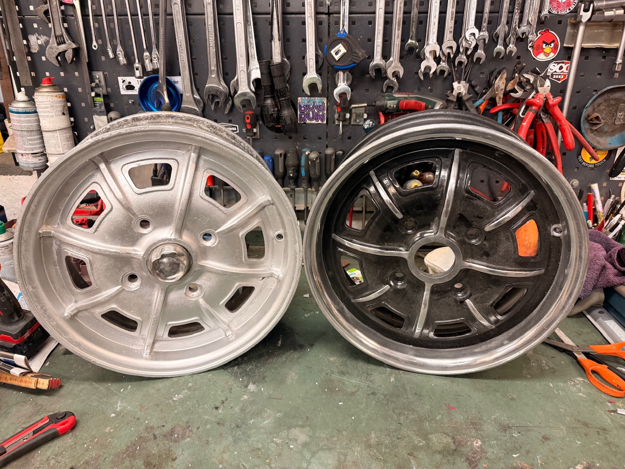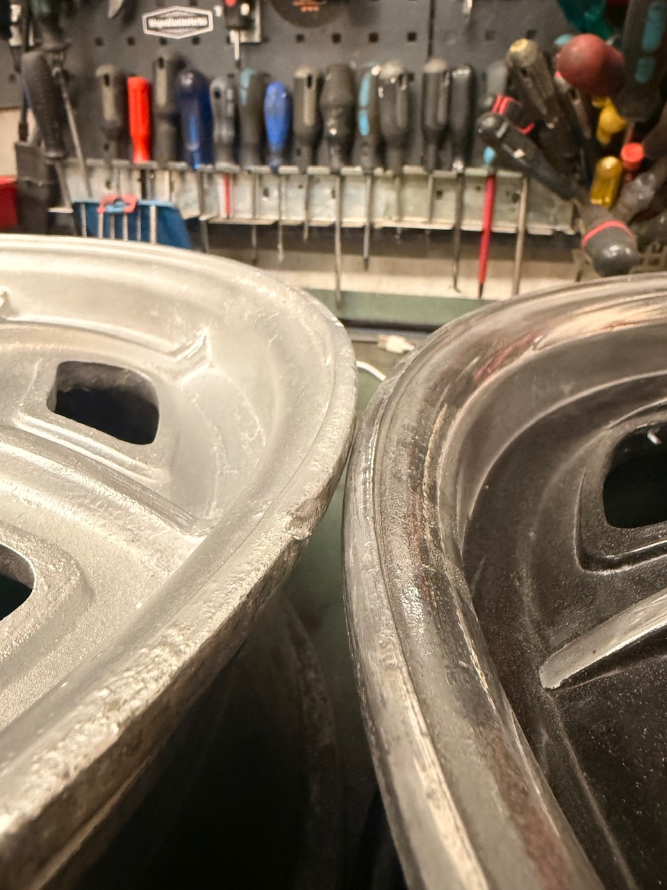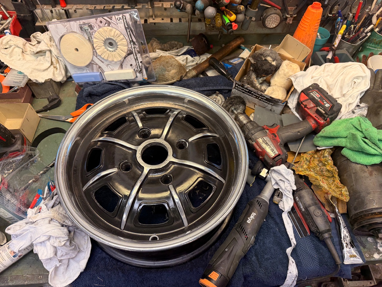 De fyra fälgarna blästrades, polerades och lackades för några år sedan. Efter det har de hängt uppe på väggen väntat och nu var det dags att plocka ner dem.