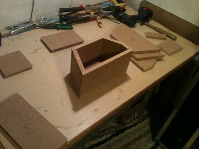 Jag har sågat ut delarna till baslådorna iaf. En massa vinklar åt alla håll men med kap/gersågen gick det fint. Sargarna och baffeln blev bara 144mm hög vilket gav att jag kunde såga dem stående med en precision på iaf 0,5°. Vilket duger gott och väl här.