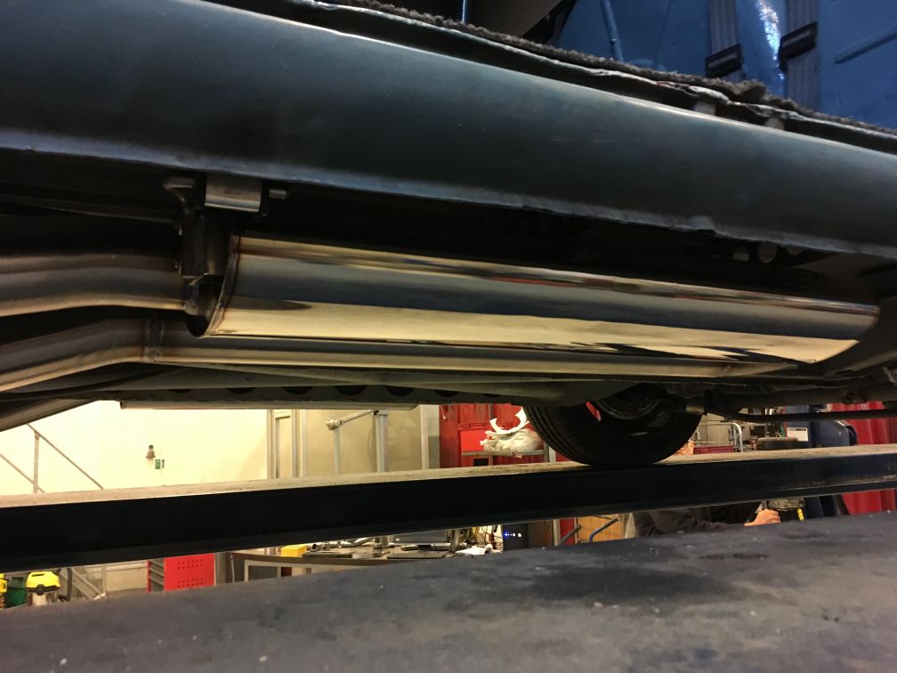 De som trodde att Leichtbau bara står i garaget och samlar damm nu hade fel. Utvecklingen måste fortsätta. Blev ett helt nytt avgassystem nu. Byggdes från scratch hos Martelius Exhaust som verkligen vet vad de håller på med. Inget ditåt chansande med rörstorlek och längder utan allt räknades ut enligt motorns egenskaper. Primärrören är exakt lika långa och gör en sväng bakåt för att sedan komma till en triangelkollektor framåt på bilen. Efter kollektorn går rören ihop till ett X för att sedan krypa ut under trösklarna där det sitter varsin rostfri dämpare och utblås framför bakhjulen på var sida. Otroligt tight och snyggt byggt system som troligtvis ger mer effekt än det gamla med öppna megafoner. Tyst blev det oxå..tog nog bort ganska mycket av race och outlawegenskaperna men vad gör man inte för att få köra på Nürburgring..