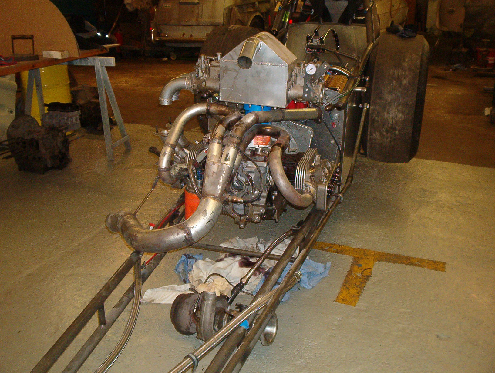 första steget till något att åka med nästa år har börjat,ner från hyllorna har vi plockat alla delar som satt på turbo motorn i jonas ghia turbo,förgasare,soppa prylar m.m bara att fixa till burken  lite insugs rör tillv montera turbon så blir det åka av,motorn får en 84 vev 5,7 stakar o 94 borr,dom här delarna i ghian med 2176a gav ca 400hk i dragstern är det typ låga 8or,bakaxeln får ett byte till 4.10 utväxl så varvar den ca 7600 över mål