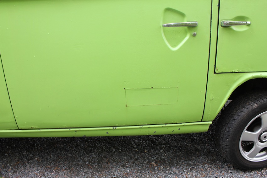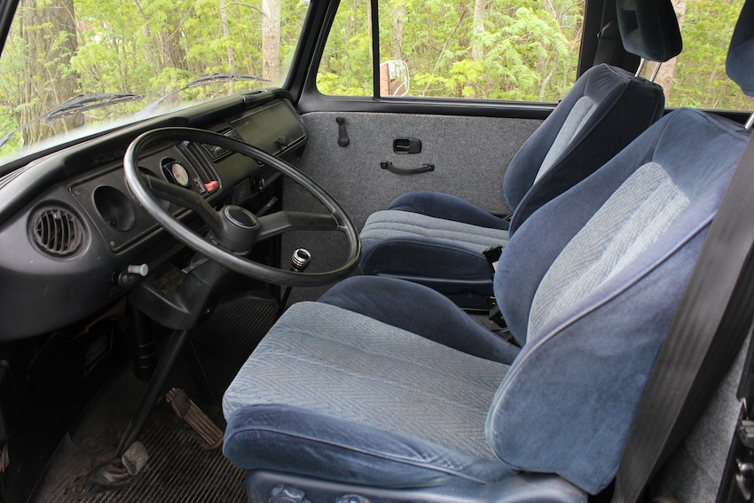 Nu så är det två framsäten och ett grått SAAB baksäte i......svart tak och matta, grått på sidorna.....typ högtalarmatta som är limmad på väggarna runt rutor å ner mot golv. OBS, den är rollad och på några ställen har det flagat.......annars är den i mycket bra skick å knappt nån rost...!! Det enda jag har bytt under 9 år, förutom olja är kopplingsvajern...och lagret i skjutdörren.....råkade visst få den i näven när jag skulle stänga.......bara körd över sommrarna...!! Lite högtalare å bas i såklart också..för den som vill spela högt utan att störa frugan å barnen hemma i huset....;-)