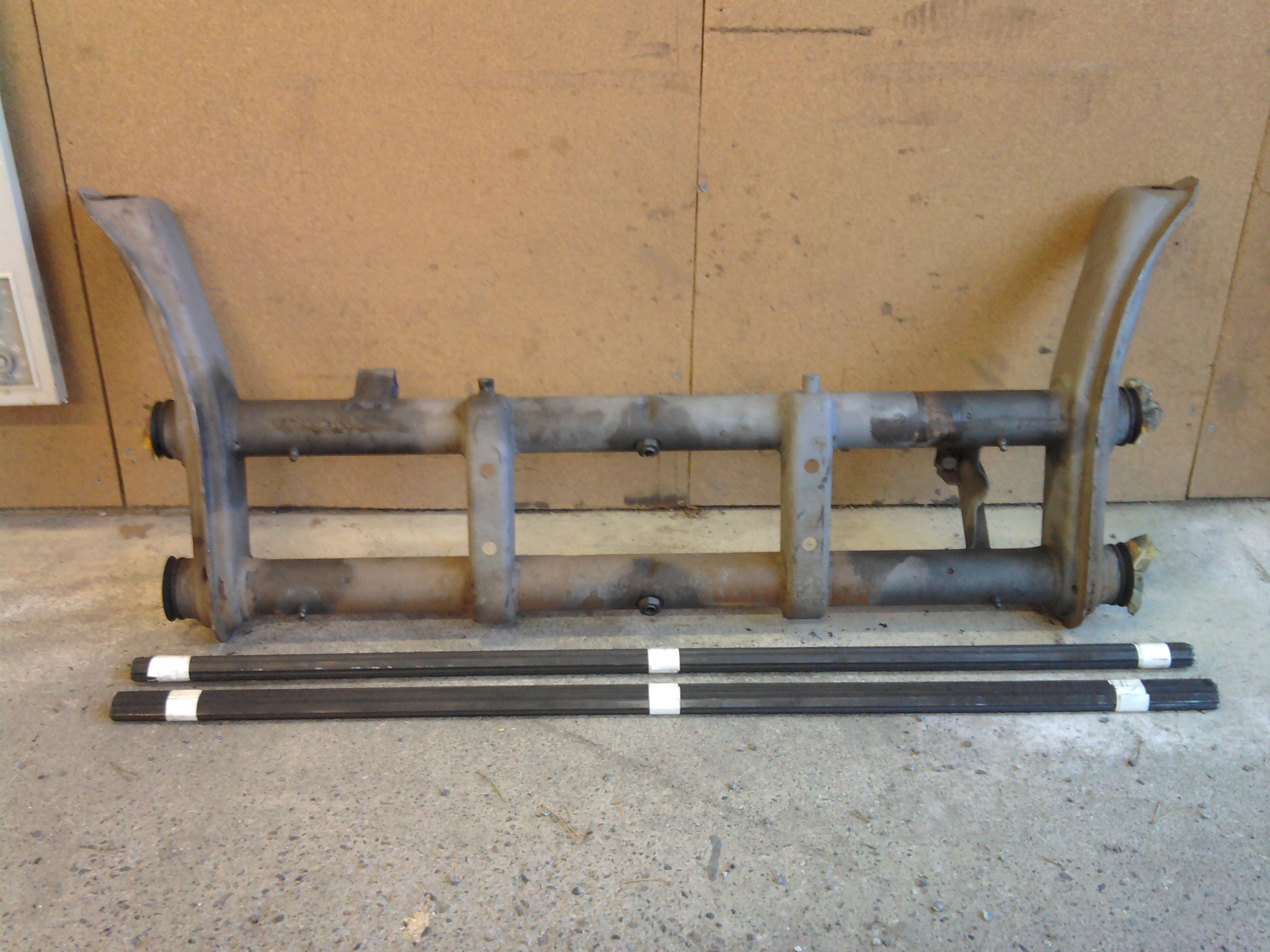Har en blästrad framvagnsstomme kulbult liggandes. Små rosthål längst ner på tornen , samt att stötdämparhålen är rostangripna och i behov av svetsning. Fjäderpaket ingår. Pris: 300:-