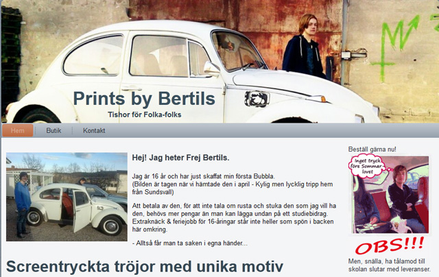 Kvalitetstryck på ekologiska material med unika VW-motiv! Beställ i hans webbutik & betala m PayPal eller kort, om vi inte ses på nån träff i sommar. http://frej.bertils.com - Finns förstås på FB också http://www.facebook.com/PrintsByBertils