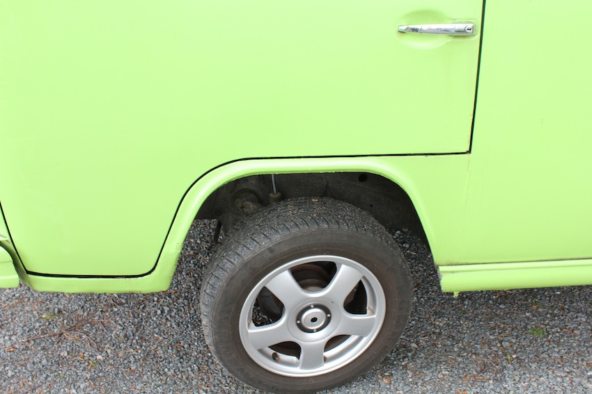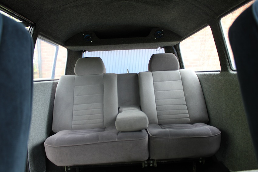Nu så är det två framsäten och ett grått SAAB baksäte i......svart tak och matta, grått på sidorna.....typ högtalarmatta som är limmad på väggarna runt rutor å ner mot golv. OBS, den är rollad och på några ställen har det flagat.......annars är den i mycket bra skick å knappt nån rost...!! Det enda jag har bytt under 9 år, förutom olja är kopplingsvajern...och lagret i skjutdörren.....råkade visst få den i näven när jag skulle stänga.......bara körd över sommrarna...!! Lite högtalare å bas i såklart också..för den som vill spela högt utan att störa frugan å barnen hemma i huset....;-)