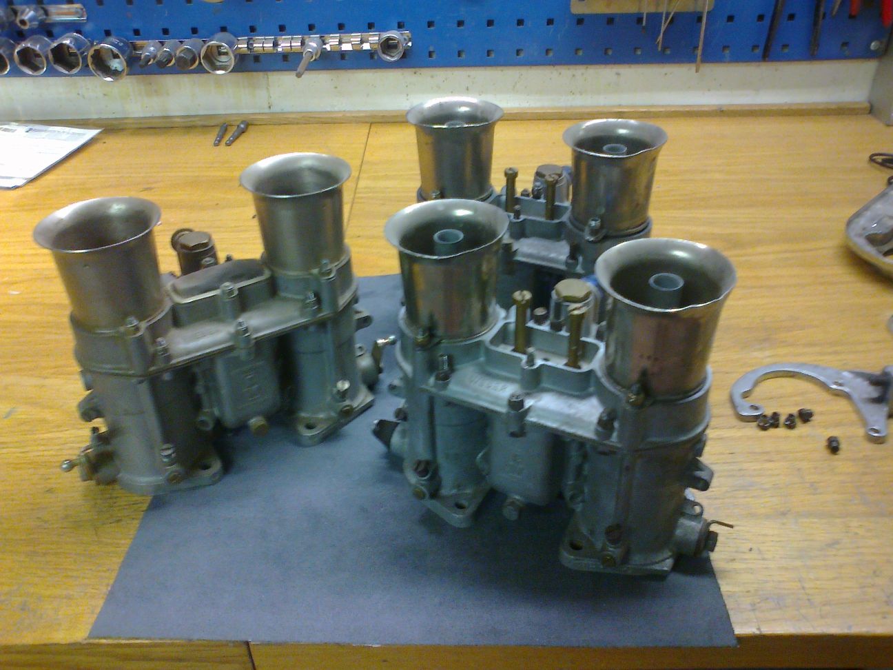 Har tre(3) stycken Italienska Ida 48or i fint skick.Alla med 40mm halsringar men den udda har olika bestyckning än paret.Spjällen rör sig fritt men har inga glapp.Dessutom finns två höga K&N luftrenarskal utan filter(övre del saknas på bild men medföljer naturligtvis). Sen ett par speciella fästen för länkage direkt på förgasarlocket med holkmuttrar(en saknas).Kan hämtas till BRC.