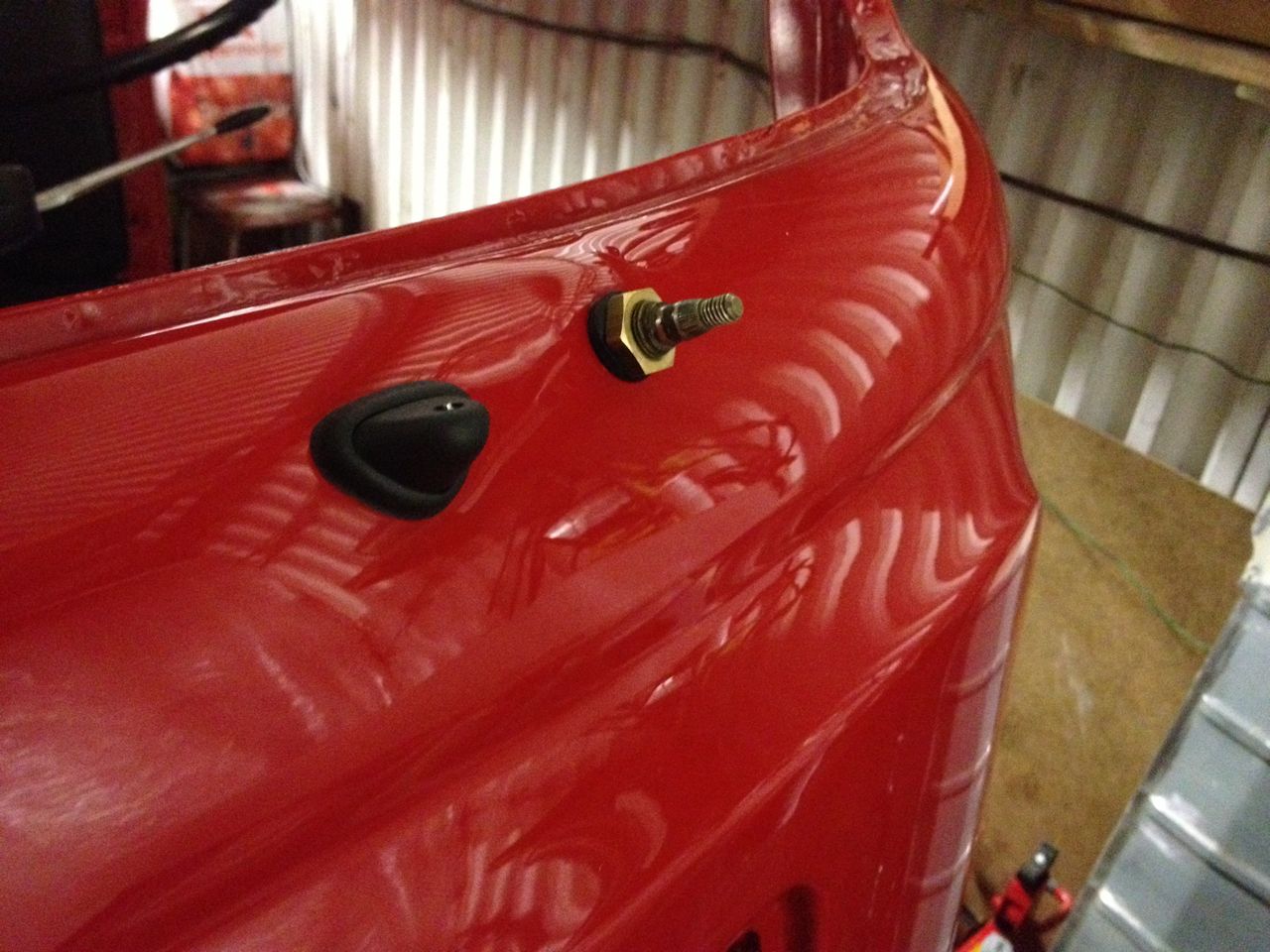 Passade även på att tvätta av alla fästdetaljer till skjutdörren. U-gångjärnet ska lämnas till lackför att även den bli röd.