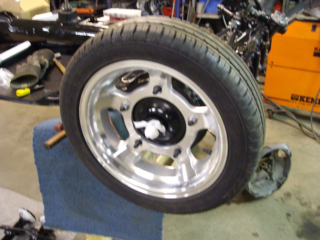 Så sakta sakta så kommer bilen ihop, har ställt på karossen igen för att kolla så det blir bra med däcken och frigång och så. Och frigången är lite kass behöver rulla skärmkanterna för att det ska gå att styra. Har lånat ett par Gammal skärmar som jag tänkte ev köpa men det blir nog inte så för jag vill inte borra för blinkers och rulla ihop så har fina skärmar