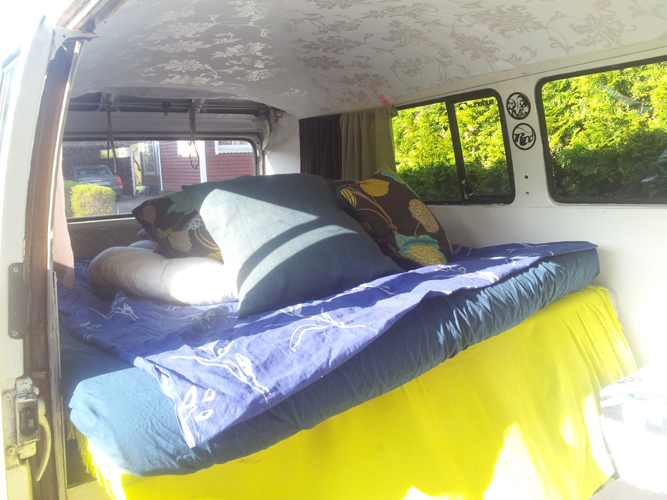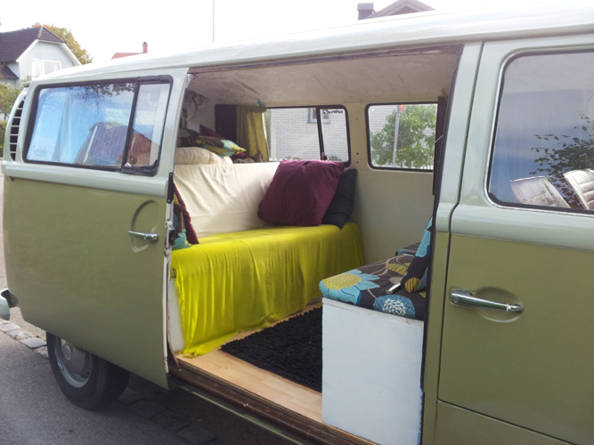 Bussen har enkel inredning med säng som lätt fälls upp till soffa.