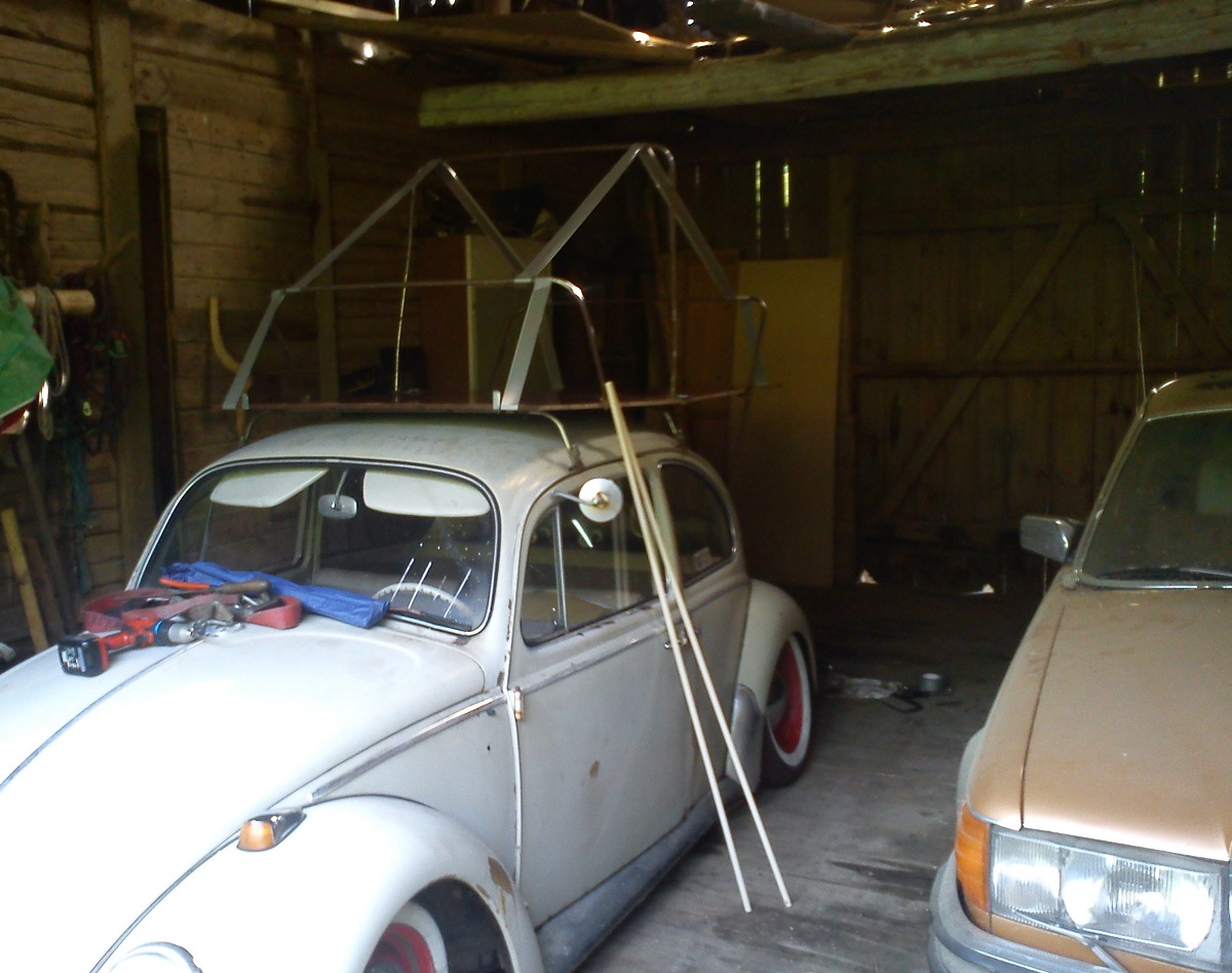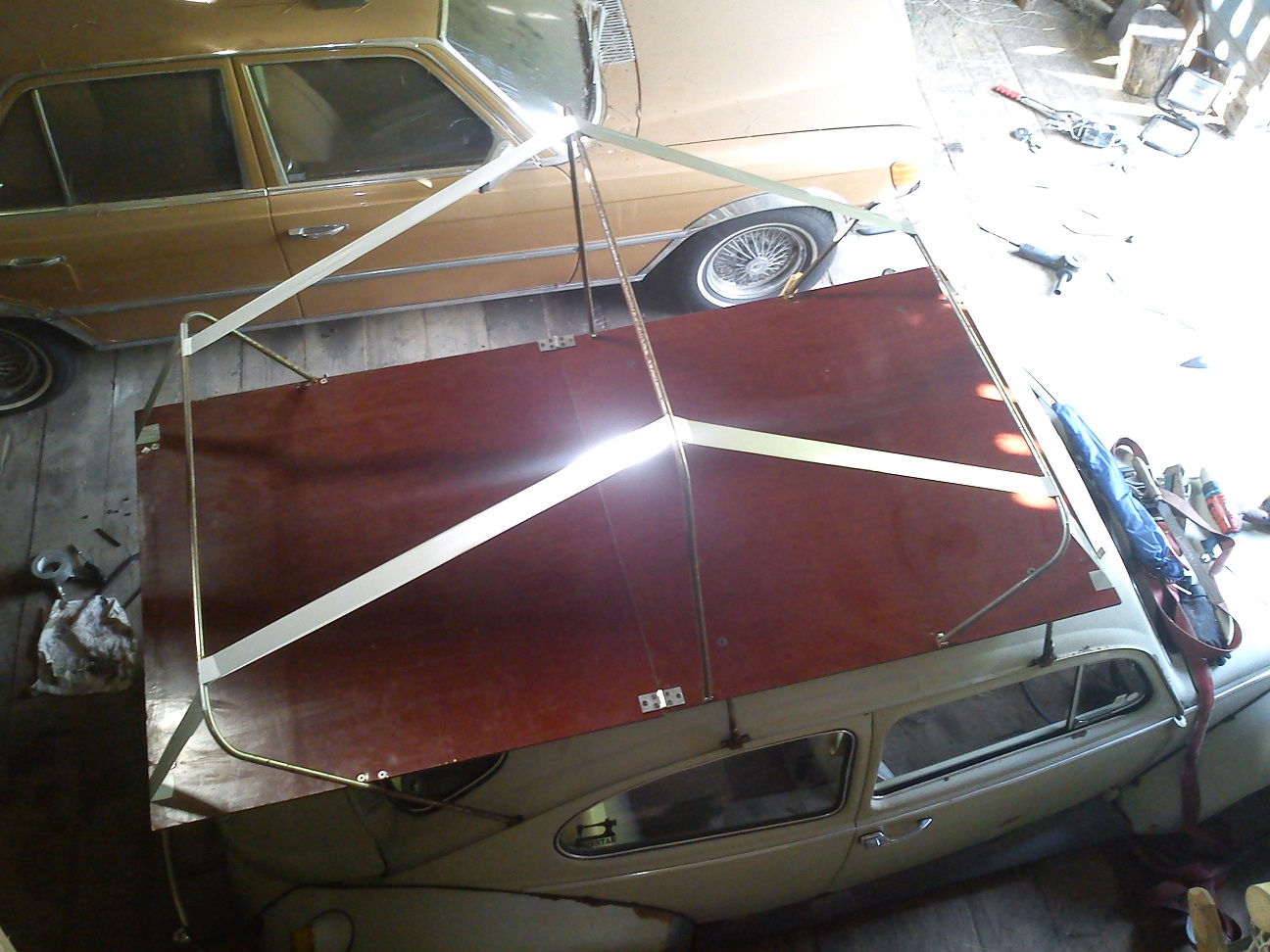 Hmm då man vill ha den så platt som möjligt(35mm) när man fäller ihop den så bör inte bågarna hamna på varann, dom är alltså olika breda, och då satte jag bågen i mitten, framför gångjärnet och då sträcker den duken så den inte kan sitta fast över allt, anledningen var att den bakre bågen som även är stödet bestämmer och är ytterst, sen kommer den främmre och när den imitten skulle fällas kom den längre fram för att inte vara i vägen men eftersom den blev lite kort(2x1050mm) och lite låg (fram och bak, ja kanske på mitten med) när madrass och kudde kom in i bilden(och det va något mer som jag inte kommer ihåg just nu), så var det lite onödigt.