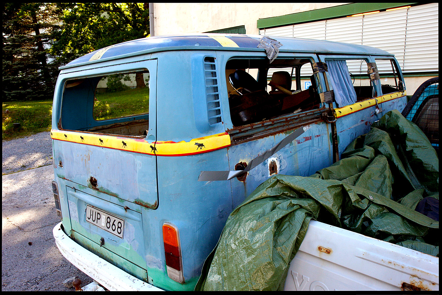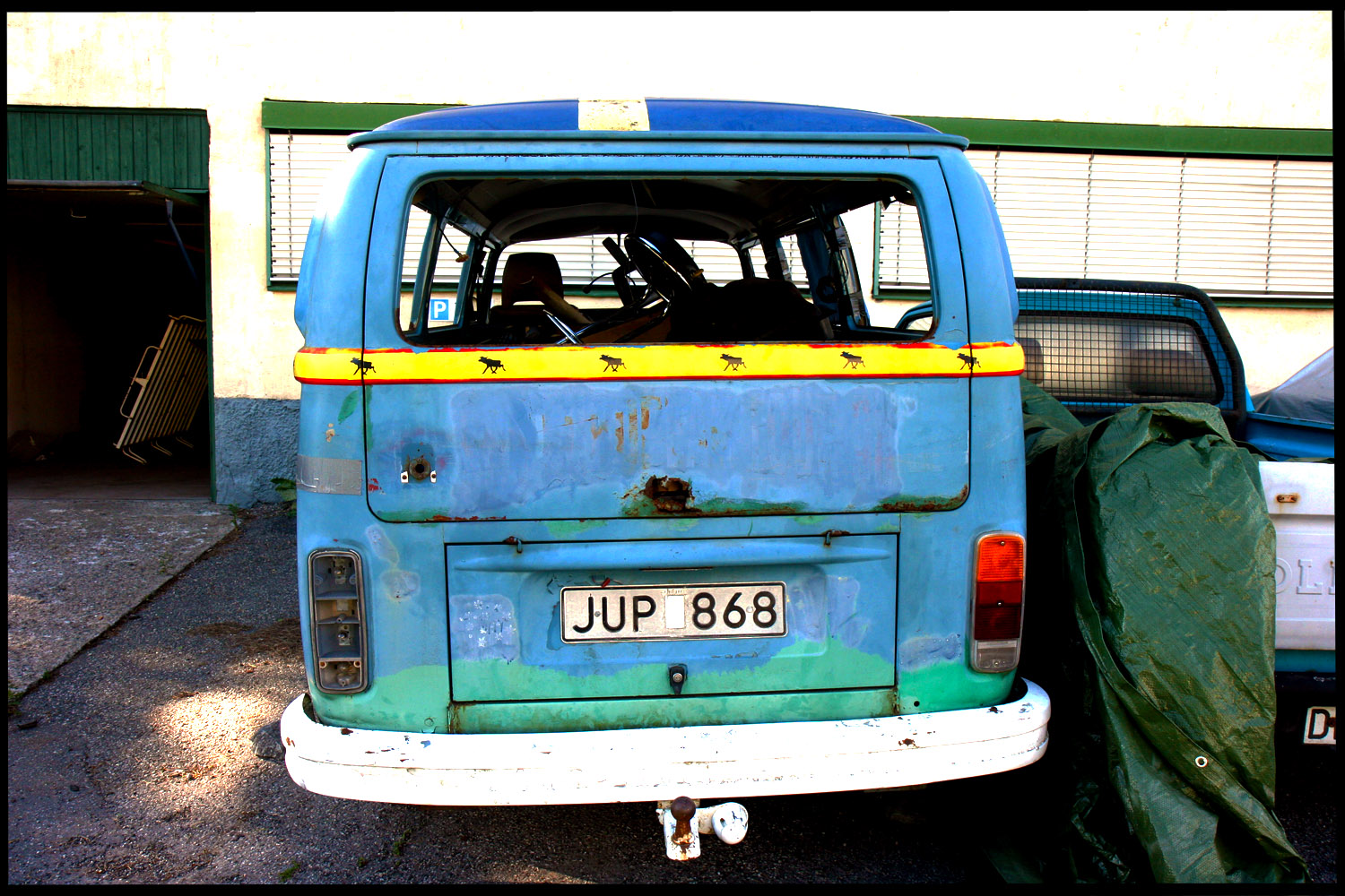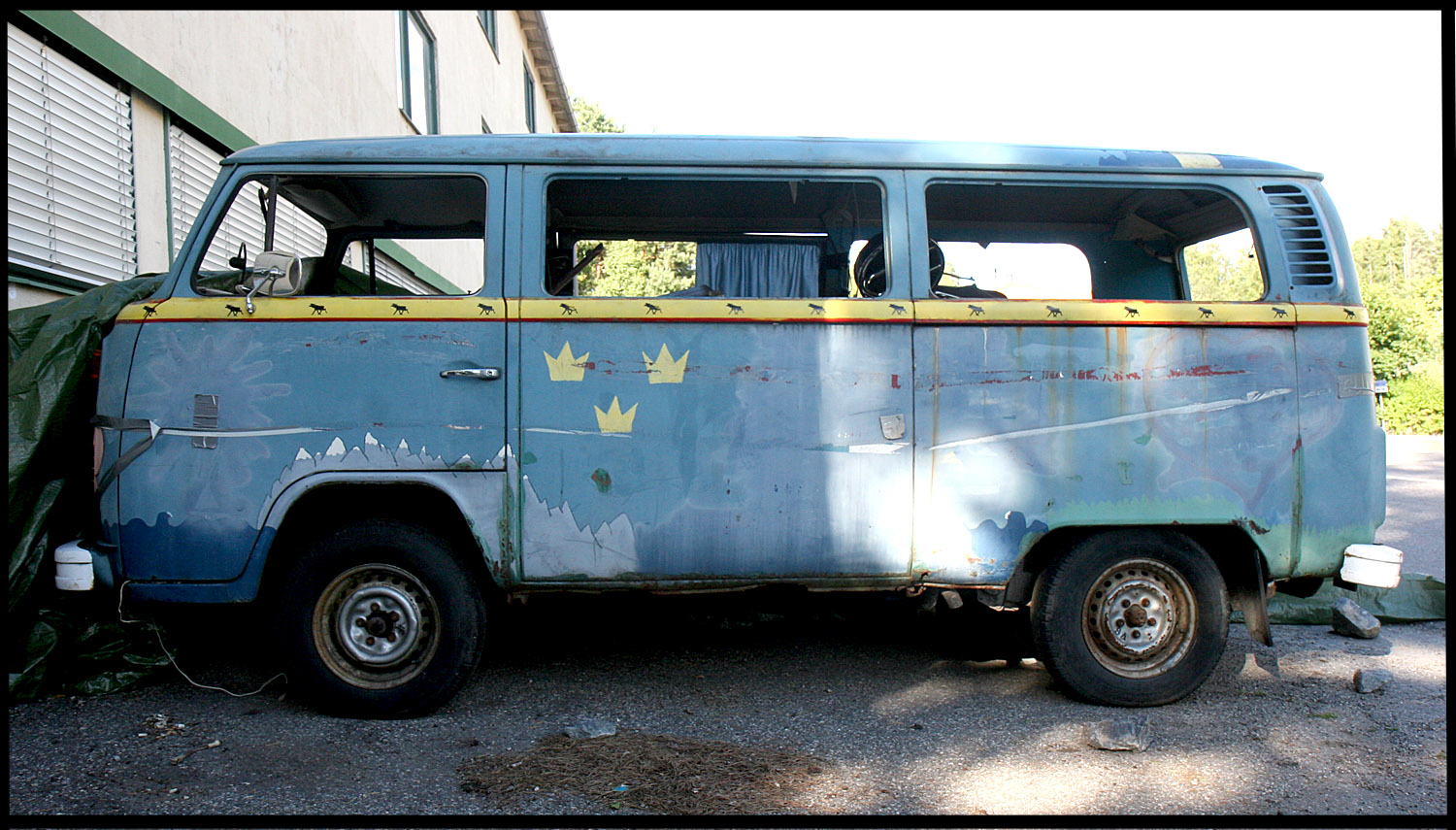 Precis som orangea bussen är även denna med i registret.  Dock är blåa bussen lite risigare om man får säga så...Samtliga rutor inslagna och allmänt risig, Bland annat saknas en bit av taket..Har varit ventilation där.  Denna är registrerad som lastbil.  Positiva saker finns dock!  Motorn är startad och går runt fint! Verkar vara låga mil när man tittar på mätaren.