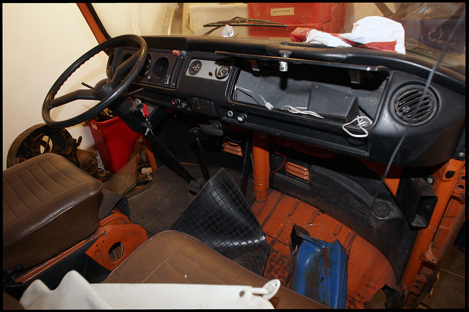 Det som är lite påbörjat är att motorn togs ut för ca. 2 veckor sedan.  (Togs ut snällt, inte med yxa!)  En del av högra insteget är utskuret (pga. rost) Fast samma del från annan buss finns löst.  Sedan är det väl inte så mycket egentligen.  Dörrarna finns förståss kvar.