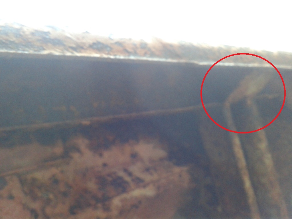 Rutten bild, men här ser man hur de har svetsat yttertröskeln för långt ut då mittenbiten saknas. Enda kontakten var plåtstrips med 30 cm mellanrum (inringat i rött)