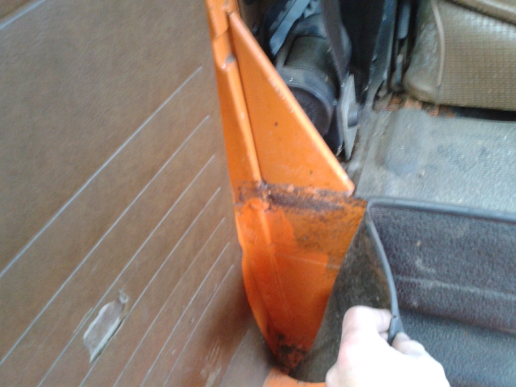 Vid reparationen av golvet verkar de ha målat en bit upp på "stolstorpeden" Tyvärr har rosten börjat komma en bit upp, misstänker att det är ungefär där innerskärmarna möter upp?