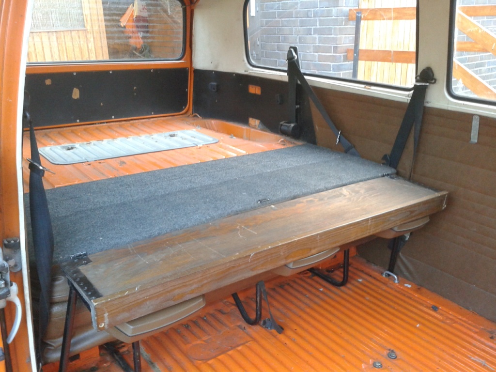 Nu lämnar vi rostens rike och koncentrerar oss på något kul istället. Det visade sig att bussen hade en detalj som jag tror är ganska ovanlig. Jägermeister som var med och hämtade bussen indikerade att han hade hört talas om denna lösning från fabrik, men aldrig sett den live under sina drygt tjugo år med Folkabuss. Ni kanske kan hjälpa mig och tala om ifall det är orginal eller ej? Jag tycker att det ser relativt fabriksmässigt ut. Bussen har fällbart ryggstöd på sista soffan. Dessutom har ryggstödet en extra utfällbar sektion så att det blir fullängd på sängen. På så sätt slipper man Rock’n’rollsoffan.