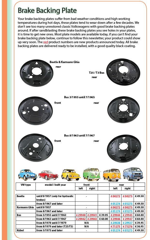 Paruzzi nyhetsbrev med bromssköld till Bubbla och buss, nya plåt delar till Type 3 och många fler delar till Bubbla och Buss.