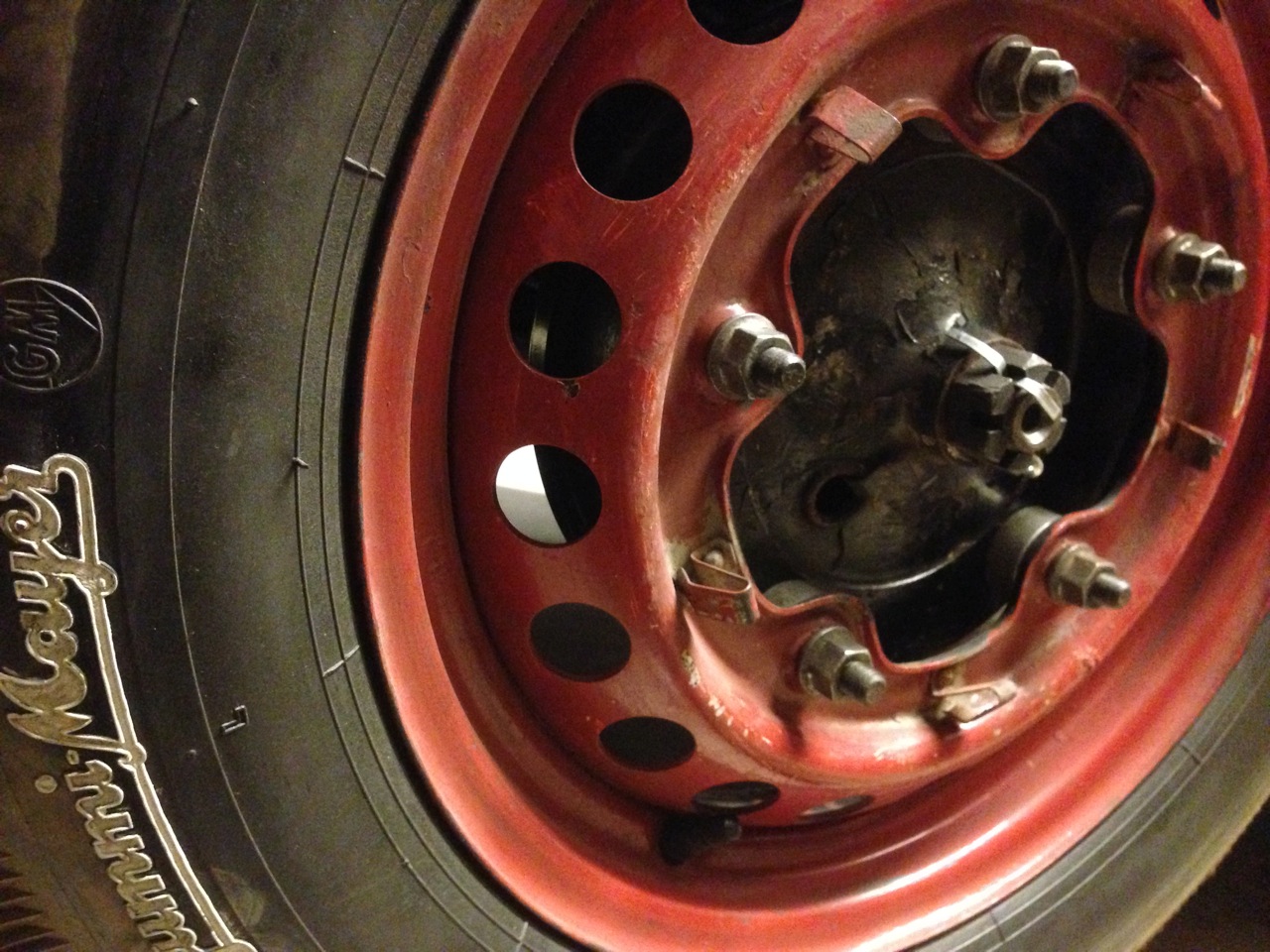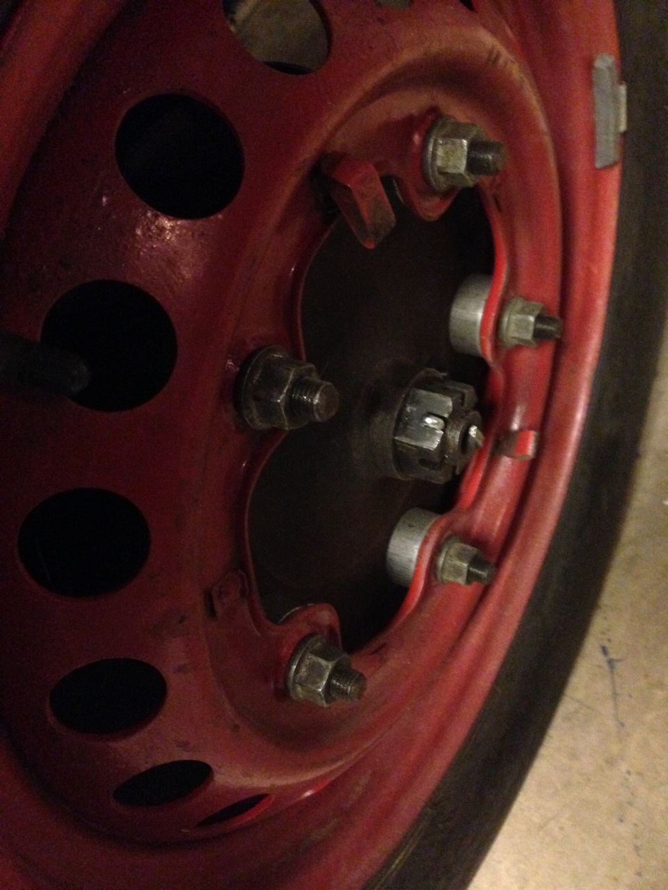 - Först pinnbultarna. M10 in i trumman, liten krage mitt på, långa M12 utåt för att tillåta distanser.