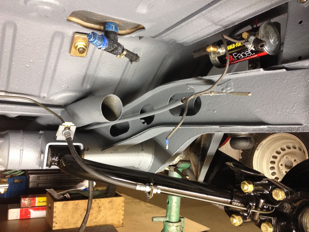 svetsade dit ett nytt fäste för bränslepumpen istället för det som var skruvat fast. sedan maskerades det som fasiken så inte grannbilarna skulle få sprutdamm på sig. 50% svart och 50% vit body blandades och och sprutades på.
