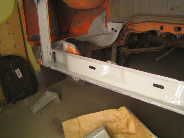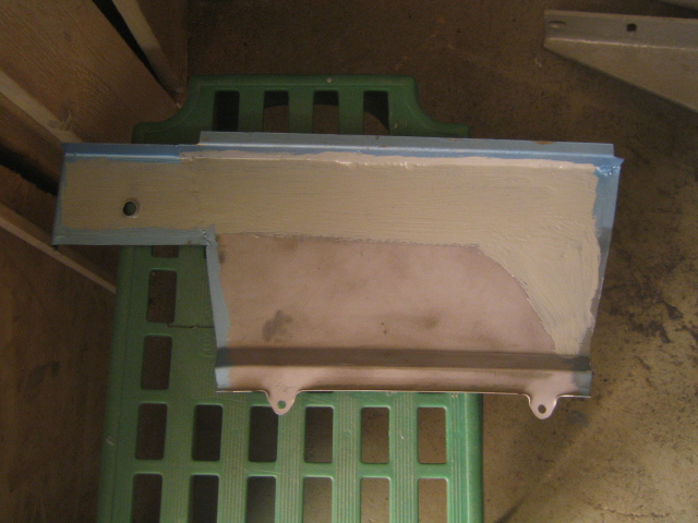Sist blev det ett lager epoxi medans man kommer åt. Där nästa plåt skall ligga dubbelt mot denna plåt har jag lämnat plåten bar för att kunna lägga svetsprimer där.
