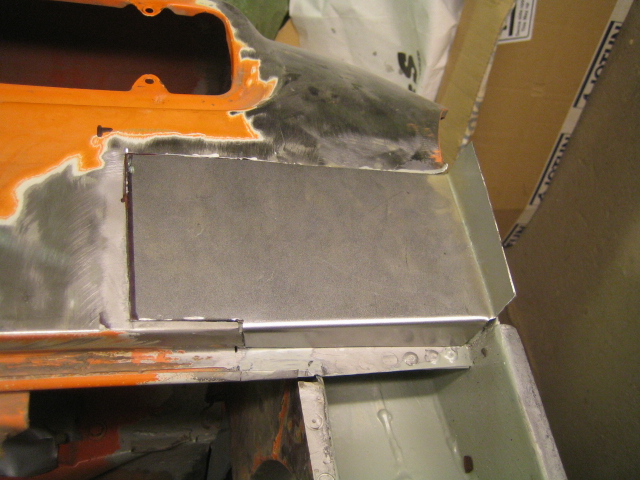Efter stolpen gav jag mig på ytterplåten på högersidan. Läskigt i och med att det kommer att synas om det slår sig plus att risken för att det slår sig är stor i och med att det är mitt på plana ytor utan förstyvande kanter. Men jag tror att det gick bra. Jag punktade försiktigt med korta mellanrum och sedan helsvetsade jag korta sträckor i taget. Jag svetsade då på olika ställen hela tiden och tog god tid på mig så att det fick kallna ordentligt mellan varven. Notera också att jag har bockat till och slipat yttre vecket på plåten som hörnet "står" på. Lite trickigt, men det gick till slut.