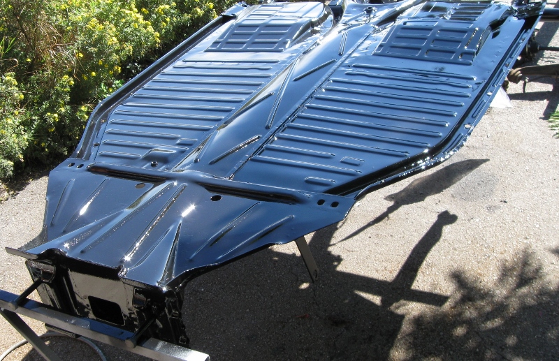 Bottenplattan renoverades och kortades enligt Fiberfab manualen. De första bilderna är tagna på den gamla bottenplattan och sedan följer några bilder på bottenplattan som renoverades och lackades utomhus i September förra året. Den främre delen av bottenplattan återanvändes från den amerikanska då donatorbilens ramhuvud var helt slut.
