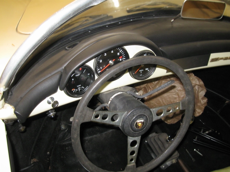I instrumentbrädan satt det instrument från en Porsche 912, en rattstång från en typ 1 70-ia tror jag, lite icke tids enliga knappar och så var ett hål täckt med en aluminium plåt efter en radio som var modern på 80-talet. Då 912:ans varvräknare är större än 356 instrument så plastades det och radihålet igen så att nya hål kunde tas upp.