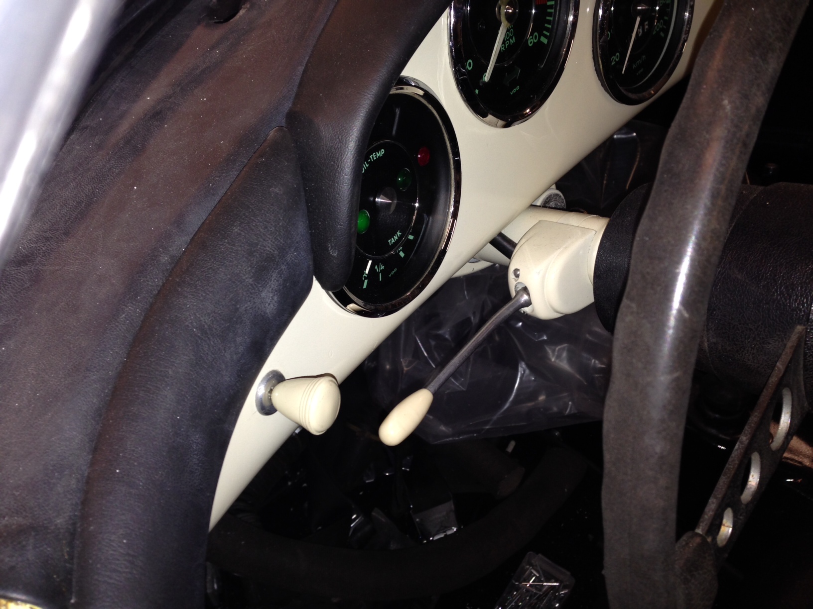 Mer tids enliga knappar och blinkers spak, äkta Porsche 356 varvräknare och kombi instrument och en replica varvräknare monterades. Den modernare rattstången kombinerades med ett äldre rattstångsrör och för att det det ska finnas stöldskydd så monterade jag även ett rattlås. En äkta Speedster har inte det men tycker ändå att rattlåset smälter in rätt bra.