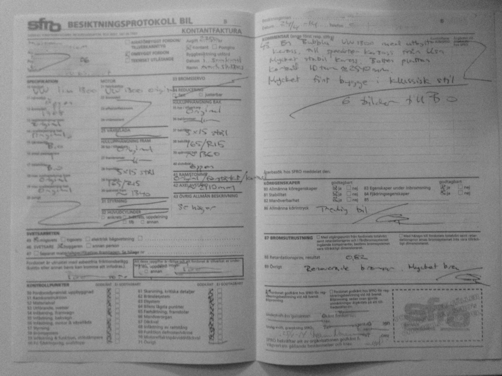 En bild på besiktnings protokollet och på bilen vid besiktningstillfället.