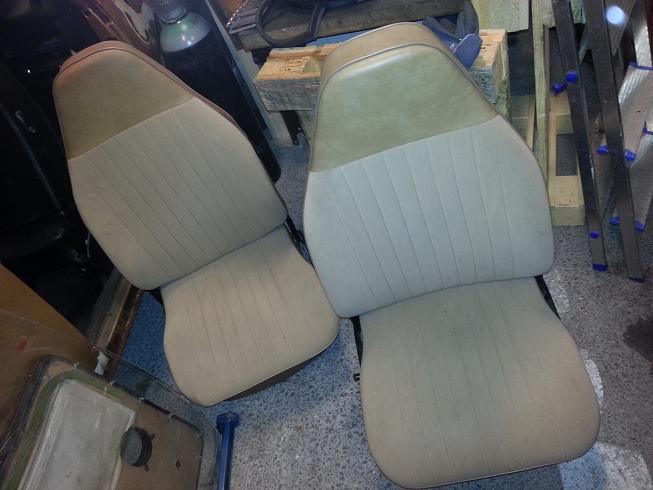 Sandfärgad inredning som suttit i en 1303 S -73. Stolarna och baksäte är i bra skick. Dörrsidorna har utag för högtalare ICQ/ac och baksätes panelenra är fula.