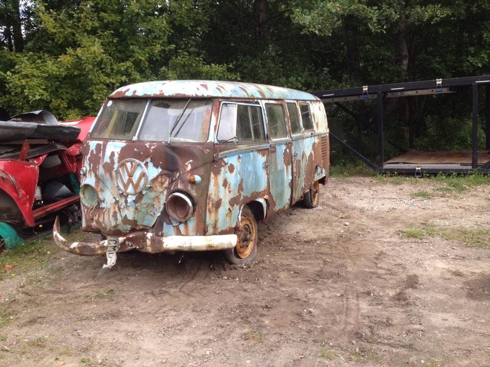 Svensksåld Microbuss M-plate 1963 i superdåligt skick (Vrak) säljes på Söndag. Org färg L289/L380 Vitblå/ turkois. bussen är inte kvar i registret saknar soffor inredning och 50% av golvet! Bilen är krockad fram, ramen är av. Nedre delen av bussen runt om är borta. B C stolpar har inslag av rost. Motorn medförjer 1200 40hk men sitter fast dvs går er runt. Rostig bensinvärmare sitter monterad, motorluckan finns. Hade hoppats på att kunna rädda den men har fått inse att det är för mkt jobb på den. En del bra grejer samt paneler finns på den. Lyxlucka bak.tre lyxlister bakre hörn är bra dörrarna fram är räddningsbara även lasteumsdörrarna borde gå att rädda. Alla rutor finns 2x poput rutor hyggligt tak med tre hål