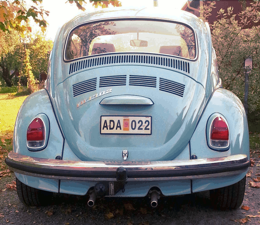 ADA är en marinablau (L54D) VW1302 från -72 och har gått 8530 mil. 1996-1997 renoverade jag bilen, lack och lite rostlagning, därefter har den gått ca.200 mil. Interiört är bilen fantastiskt välbehållen, exvis har det aldrig suttit någon radio i instrumentpanelen. Min mormor, mamma och jag är bilens enda ägare sedan den var ny.