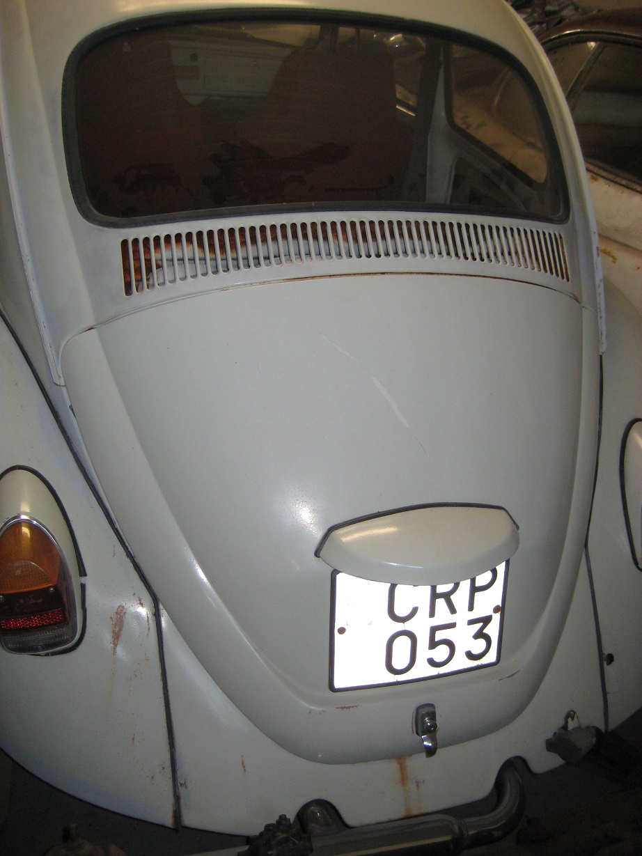 VW 1200 -67 ombyggd till -68 med 1500 motor, 12 volt och 4 bultade fälgar. Har inte varit besiktigad sedan 1995, lite rost i värmekammare höger och skärminfästning vänster bak som framgår av bilder. Ekonomiplåtar finns. Finns också en 1300 motor och komplett framvagn med skivbromsar samt diverse extra delar så som plastskärmar före -67- Bilen är komplett med alla dörrpaneler, mattor, baksoffa etc. Startar och går att köra med fungerande bromsar, men har inte rullat någon längre sträcka sedan 1996! White Spoke 14" fälgar i mycket bra skick inkl bra däck hör till bilen.