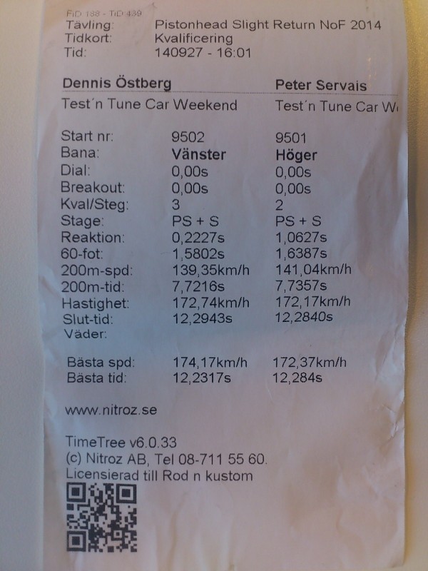 Lyckades förbättra mitt PB med 7 hundringar till 12,28 och 172km/h. Fick en bra hare i racet i form av Dennis från Gotland som högg som en kobra på granen och hela repan låg 15-20 meter före mig