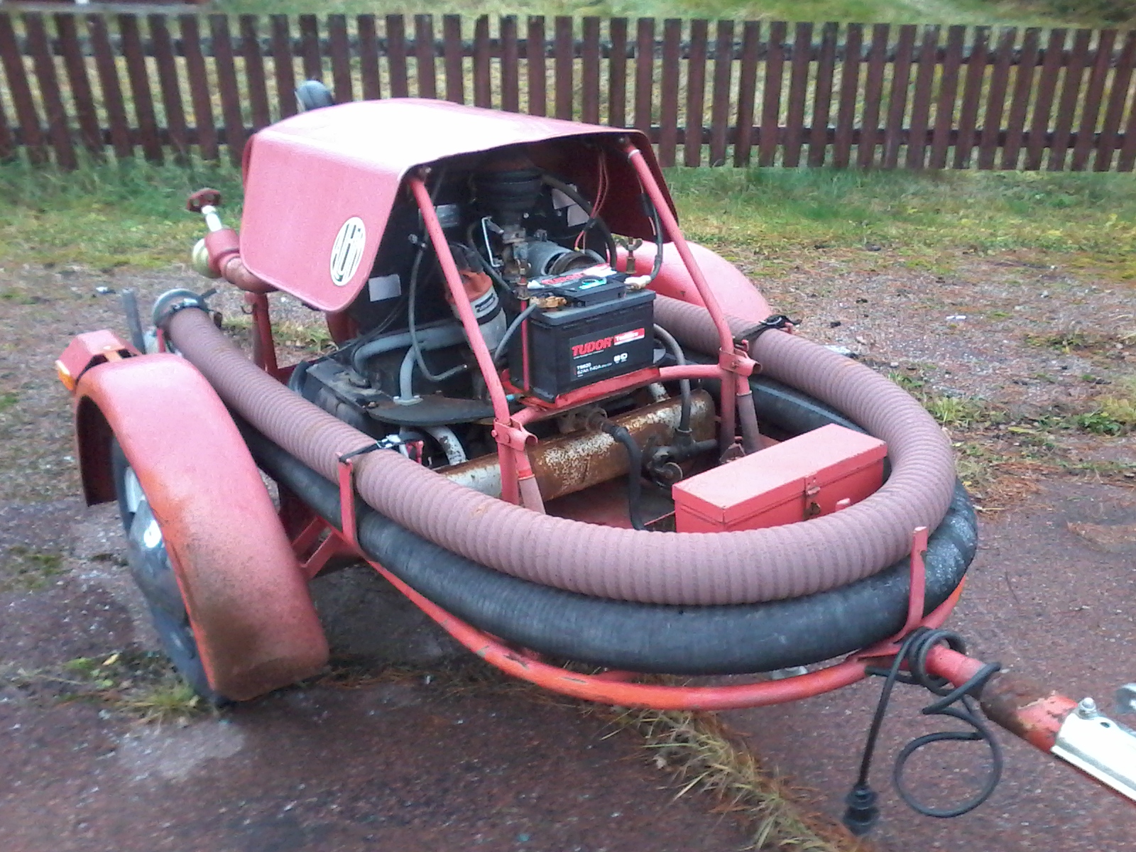 Jag har ingen vagn, men en släde med pump, som jag lovat bort till det frivilliga brandförsvaret vid sommarstugan... De kör varje sommar en liten demonstration av sina grejjor, då brukar jag kolla på deras pumpar... De ville gärna ha reservdelar, då denna pump fortfarande är viktig (vad jag förstår) ute i skärgården där brandbilar inte kommer fram men det är gott om vatten i närheten...