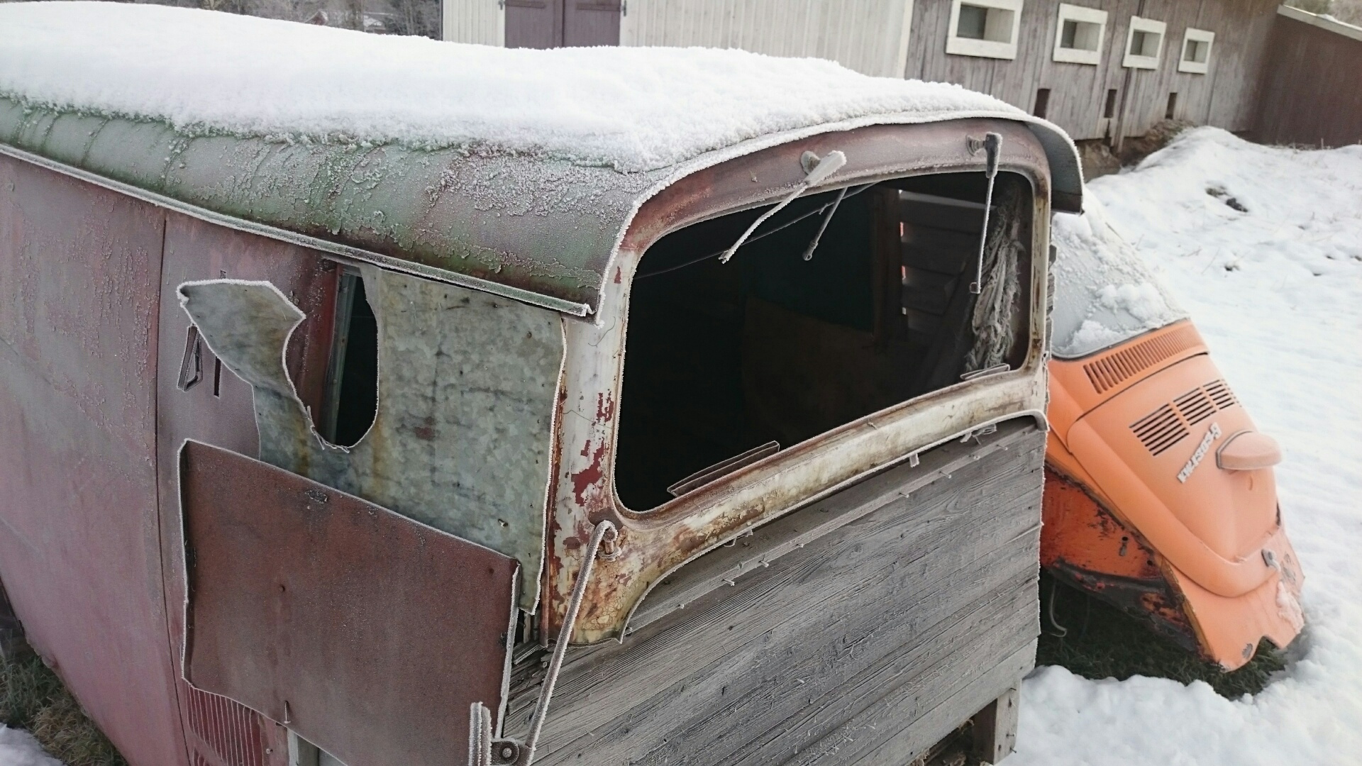 Hytten och framaxeln saknas. Framruteklippet med instrumentbräda finns.