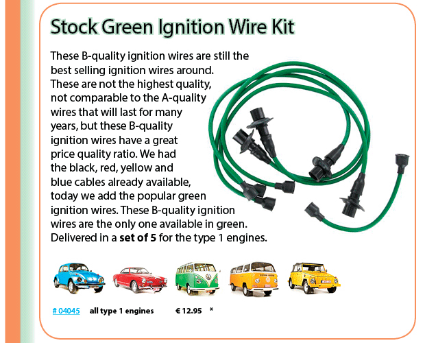 Och en produkt som passar alla Typ 1 motorer är gröna tändkablar i B-kvalitet, inte lika bra som Bosch eller original men håller fortfarande i många år. Otroligt bra pris: 130kr för ett set med 5st. Glöm inte att dom finns också i blå, gul, svart och röd!